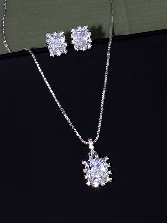 Rhodium Plated Square American Diamond Pendant Set