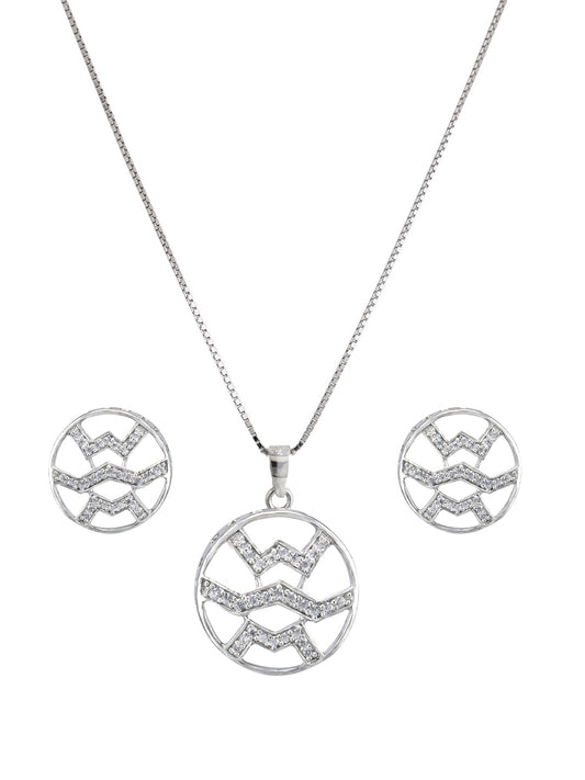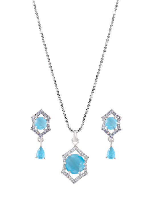 Rhodium Plated Aqua Blue American Diamond Pendant & Earrings Set
