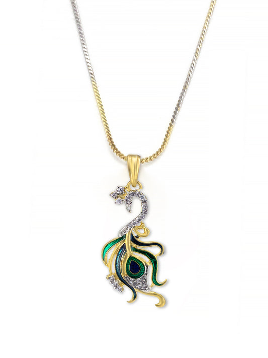 Gold Plated Peacock Feather American Diamond Pendant With Chain