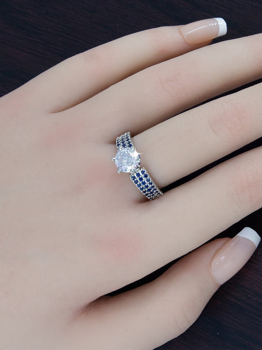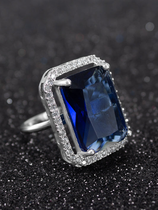 Rhodium-Plated Blue American Diamond Square Adjustable Finger Ring