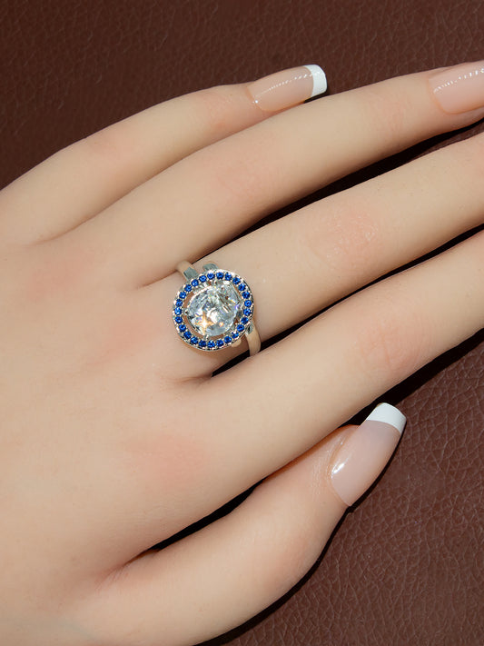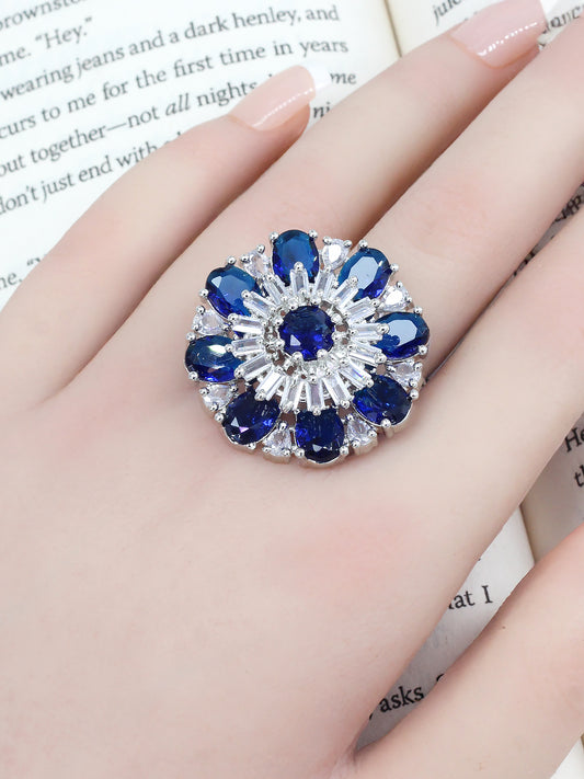 Floral Blue American Diamond Adjustable Cocktail Finger Ring