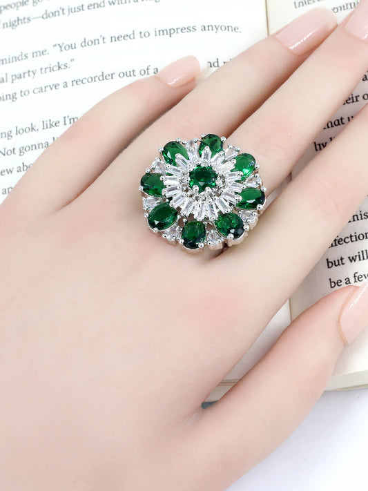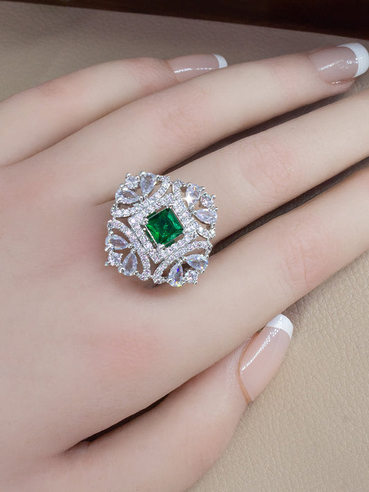 Floral Green American Diamond Adjustable Cocktail Finger Ring
