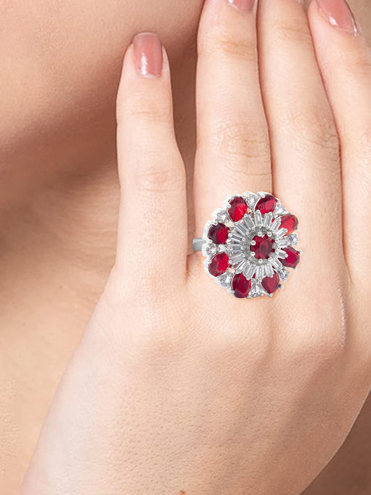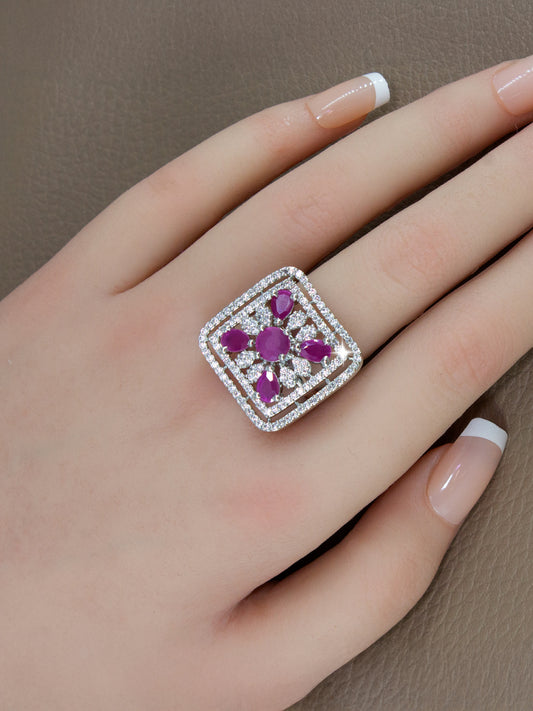 Silver-Plated American-Diamond Studded Floral Design Adjustable Finger Ring