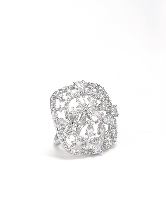 Rhodium Plated Square Cocktail American Diamond Adjustable Finger Ring