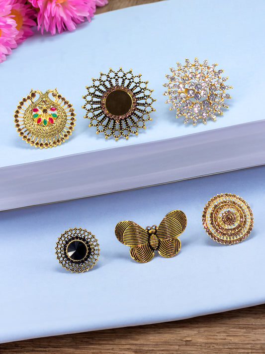 Set of 6 Gold Plated Artificial Stone Floral & Round Shaped Adjustable Finger Ring