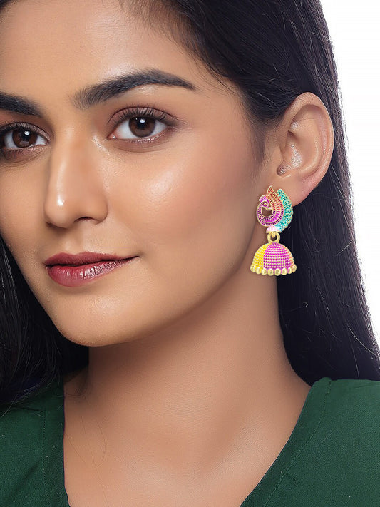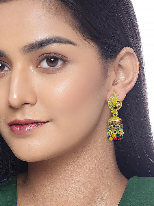 Gold Plated Peacock Multi Color Artificial Beaded Jhumki Earrings