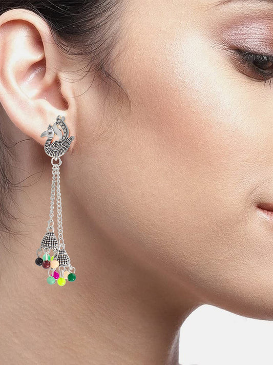 Silver-Plated Oxidised Peacock Shaped Jhumkas