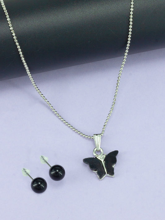 Silver Plated Black Butterfly Pendant & Studs Set