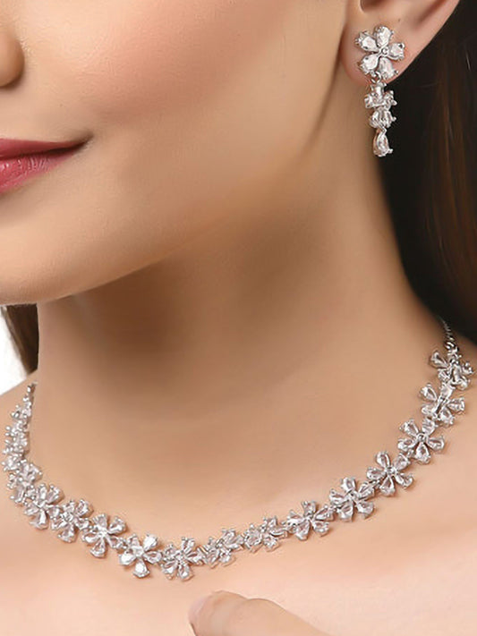 Rhodium-Plated Floral American Diamond Studded Jewellery Set