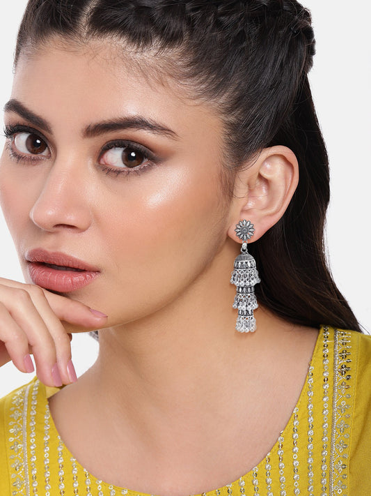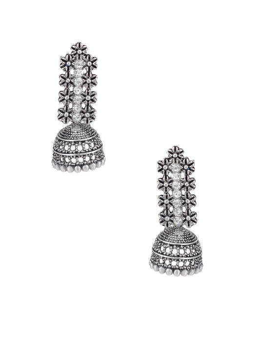 Silver Oxidised Floral & CZ Studded Jhumki Earrings