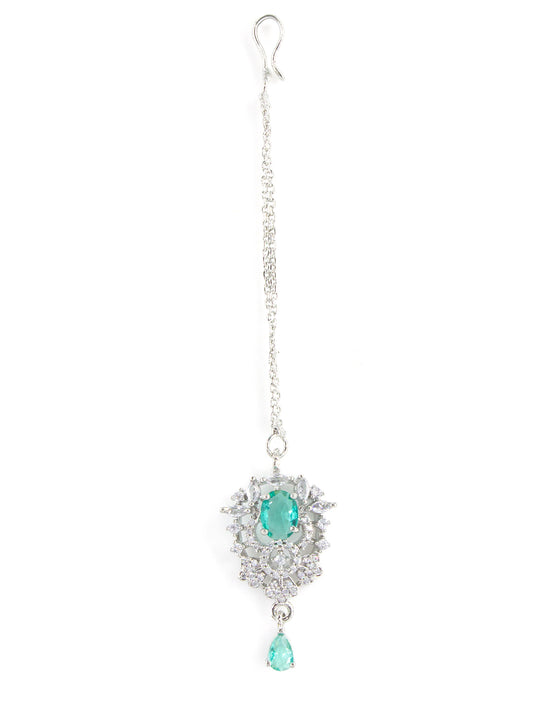 Silver Plated AD Mint Green Floral Drop Maang Tikka