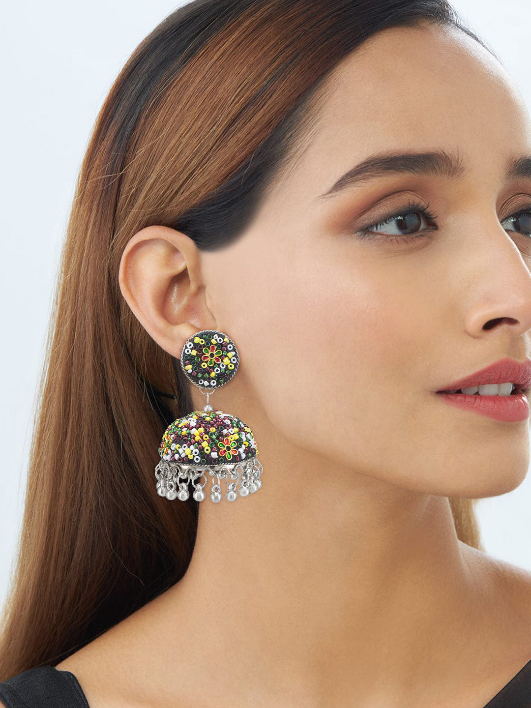 These earrings are silver plated, has mirror studded & beads drop details and secured with post and back closure.