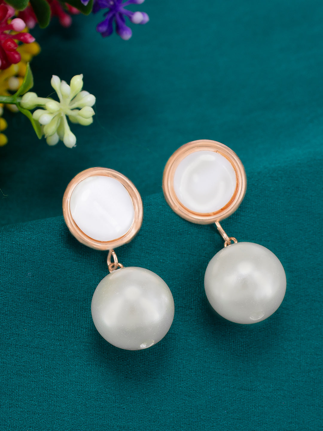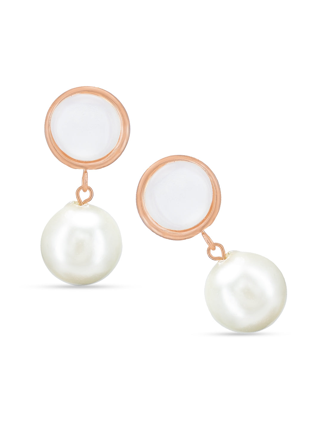 These earrings are rose gold plated has Faux Pearl Drop details and secured with post and back closure.