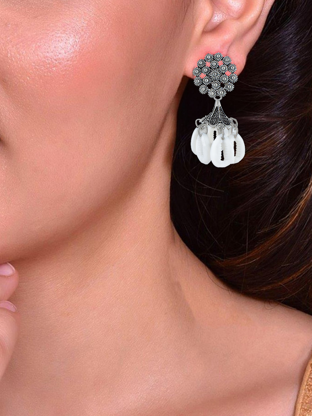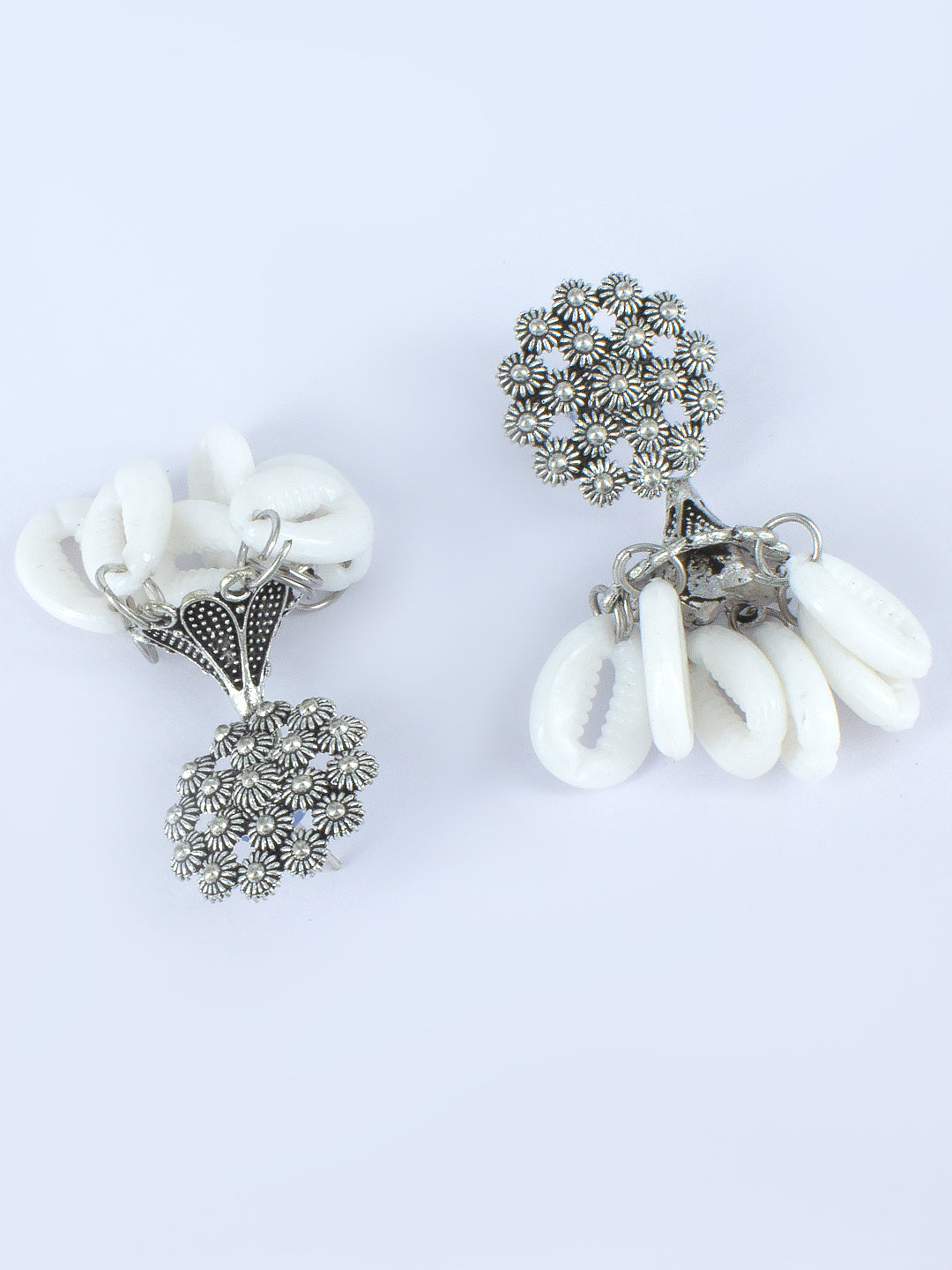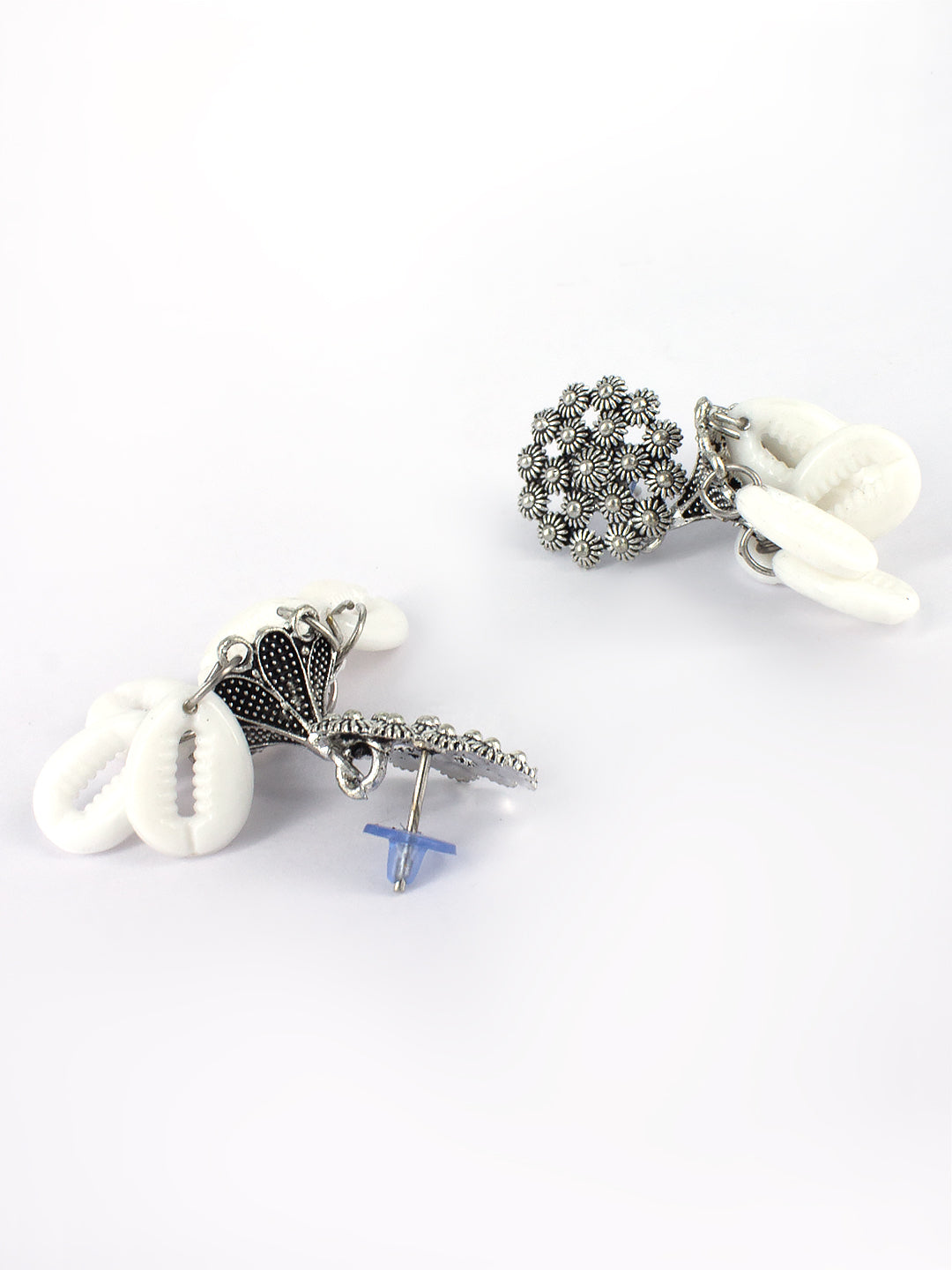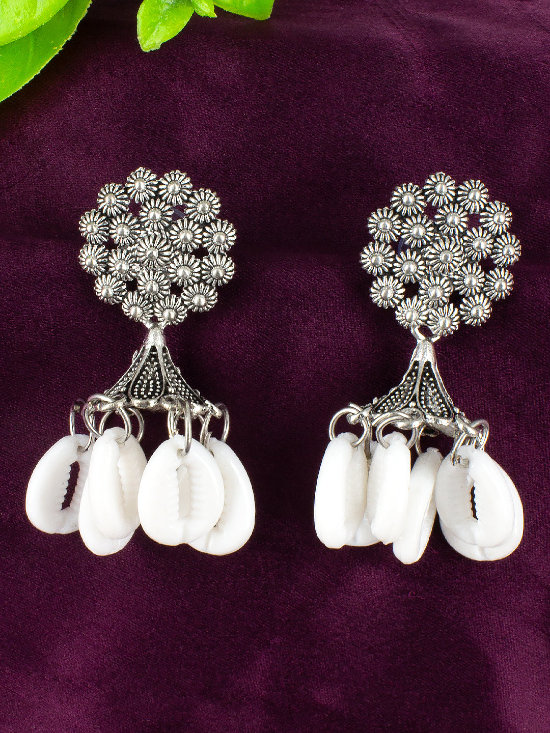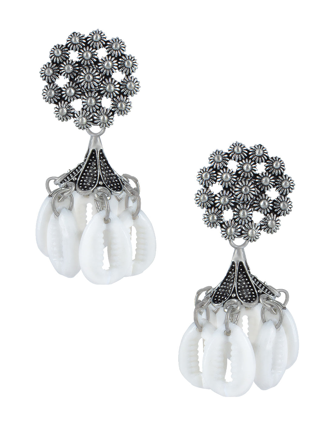 Silver Oxidised Floral & Artificial Shells Beads Jhumka Earrings