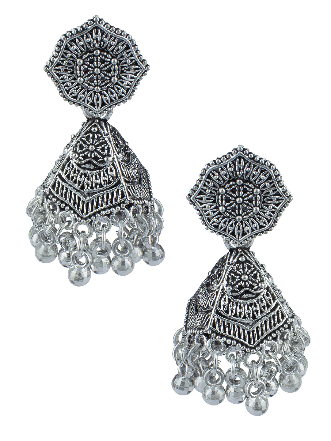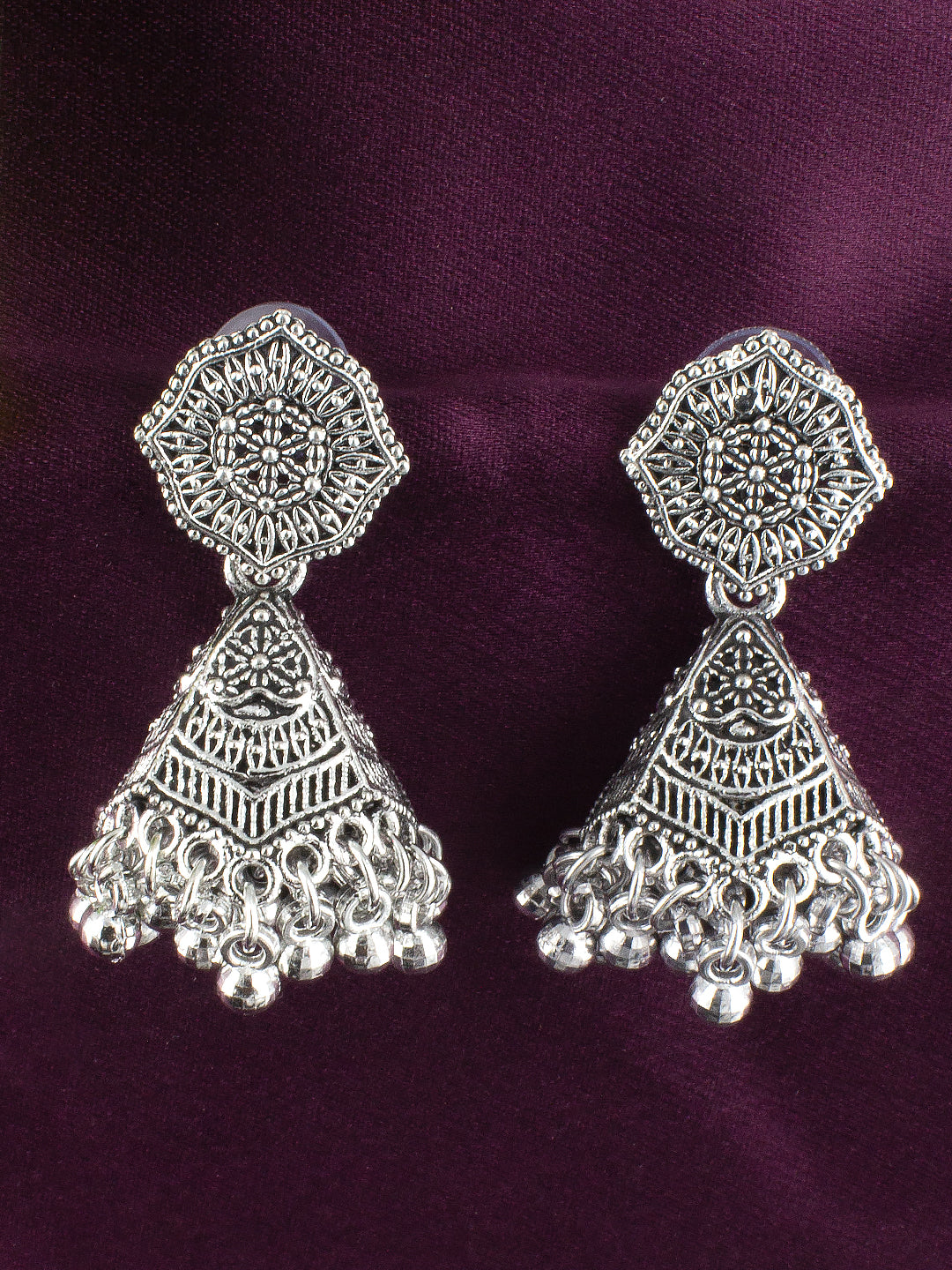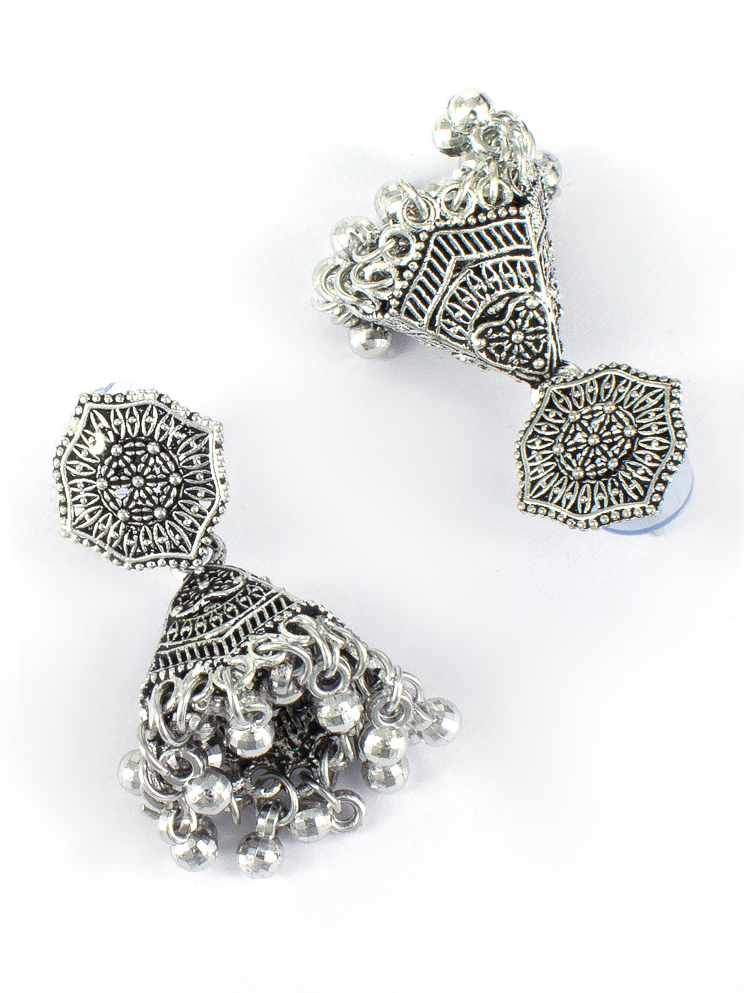 Silver Oxidised Jhumka Earrings, secured with post and back closure.