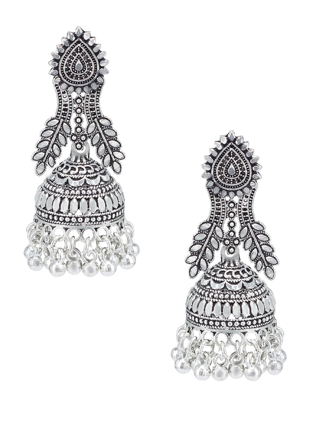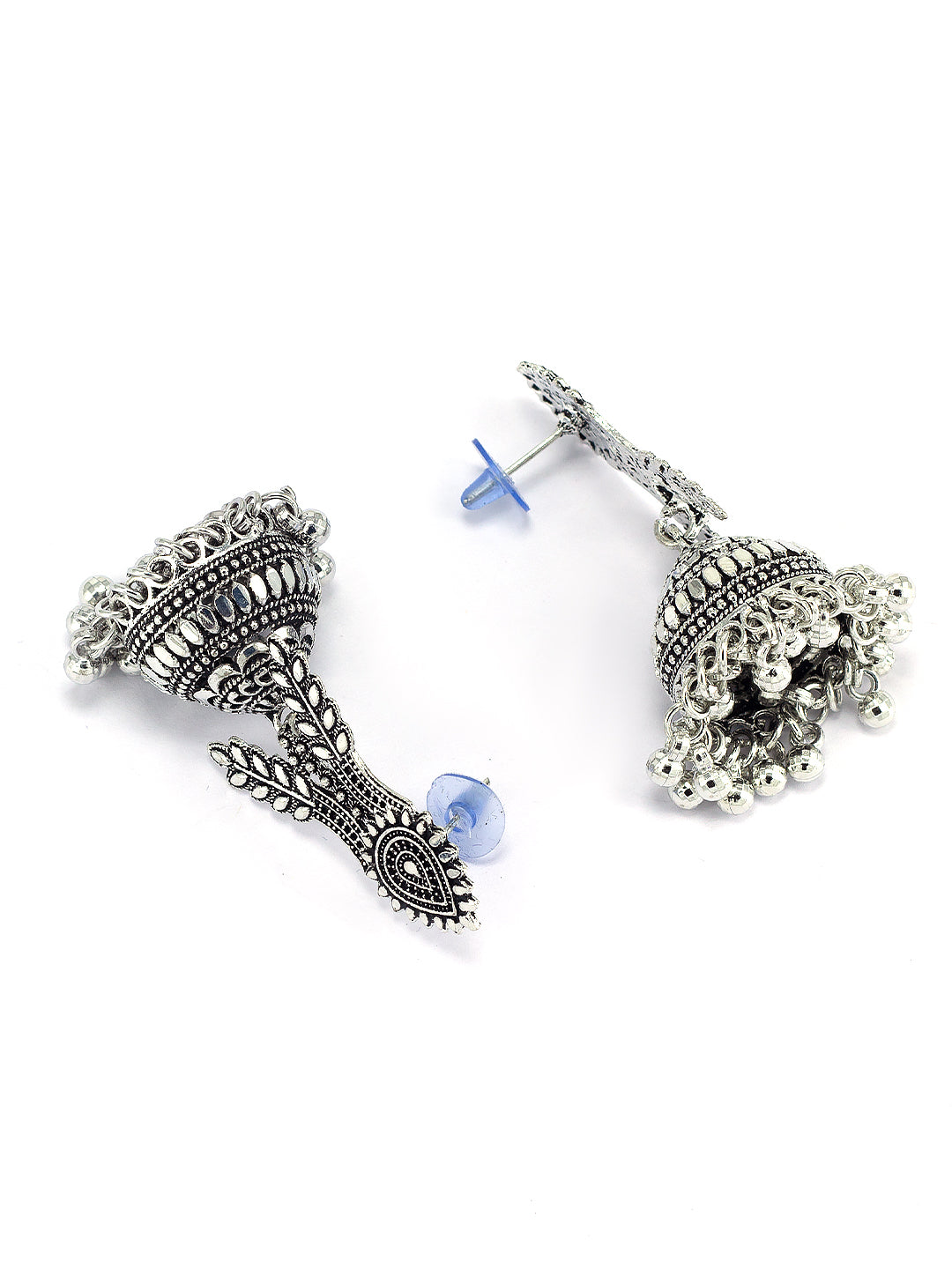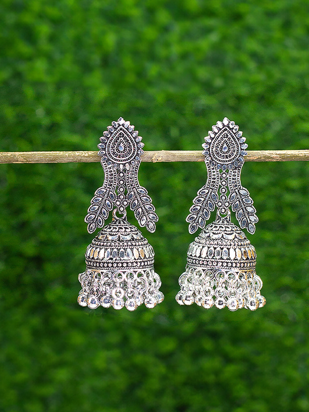 Silver Oxidised Leaf Jhumka Earrings, secured with post and back closure.