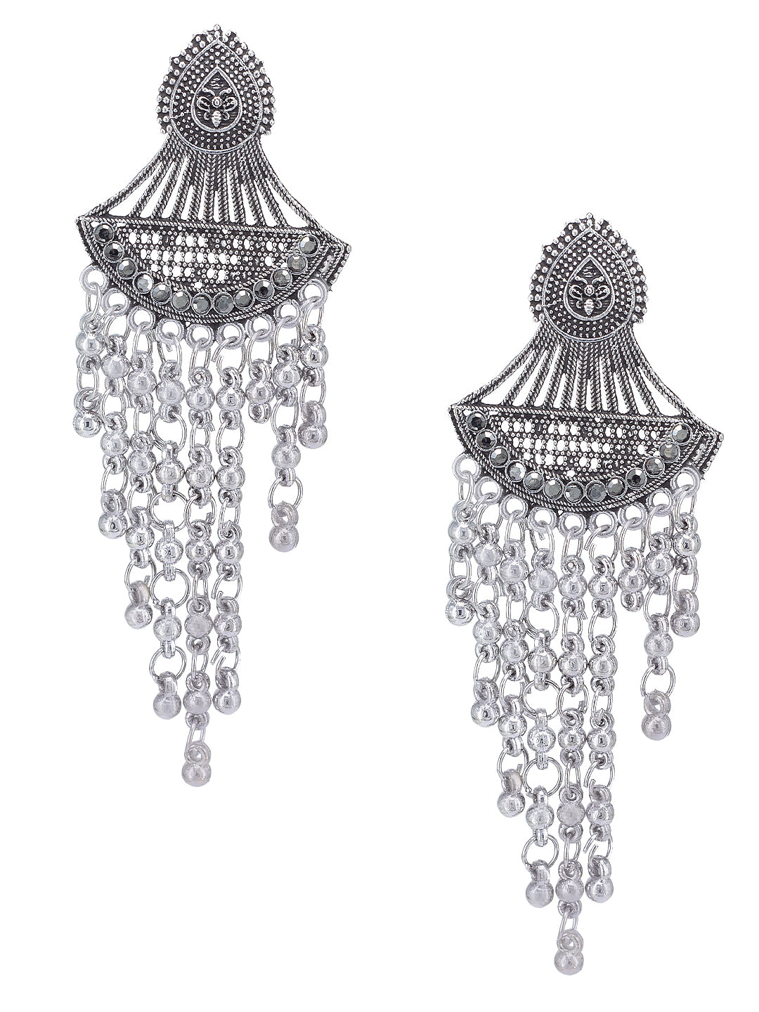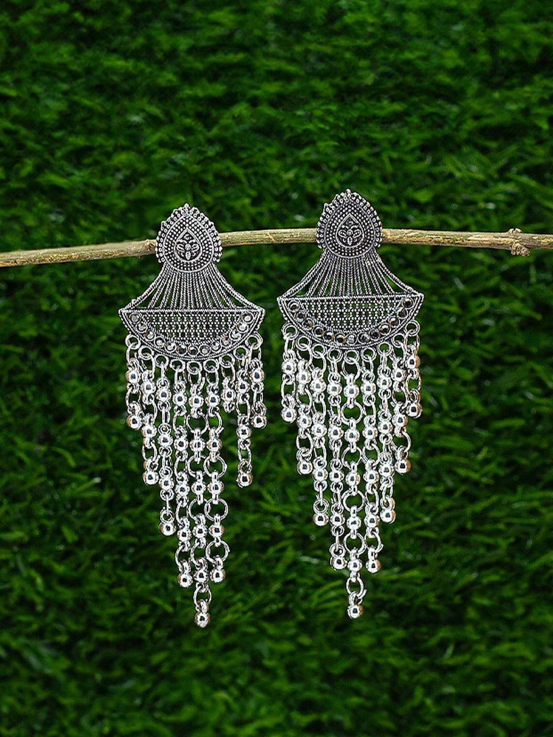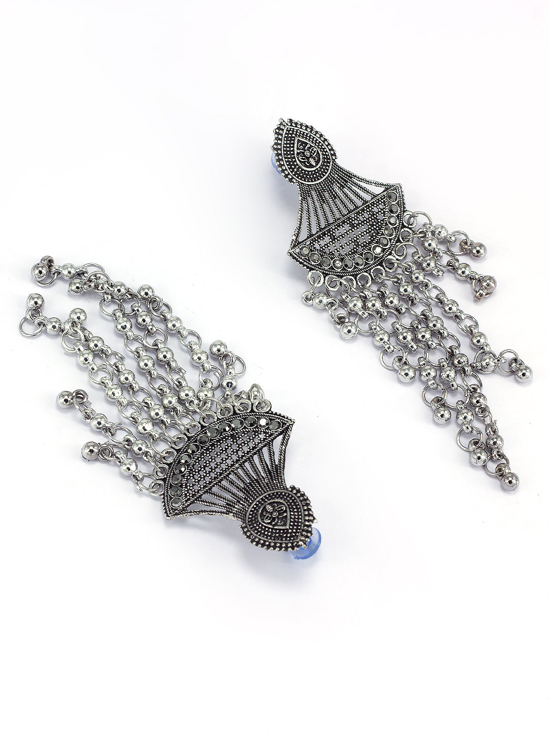 Silver Oxidised Drop Jhumka Earrings, secured with post and back closure.