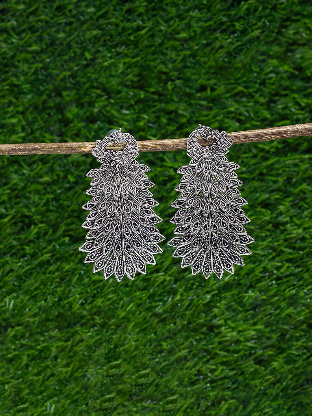 Silver Oxidised Peacock Jhumka Earrings, secured with post and back closure.