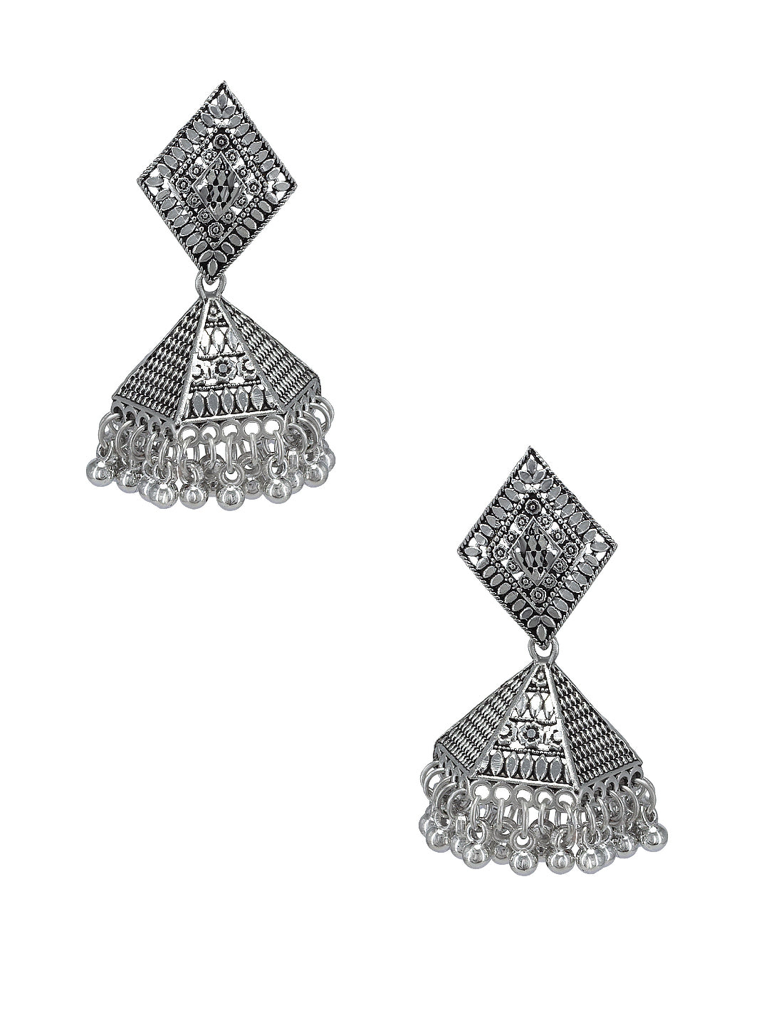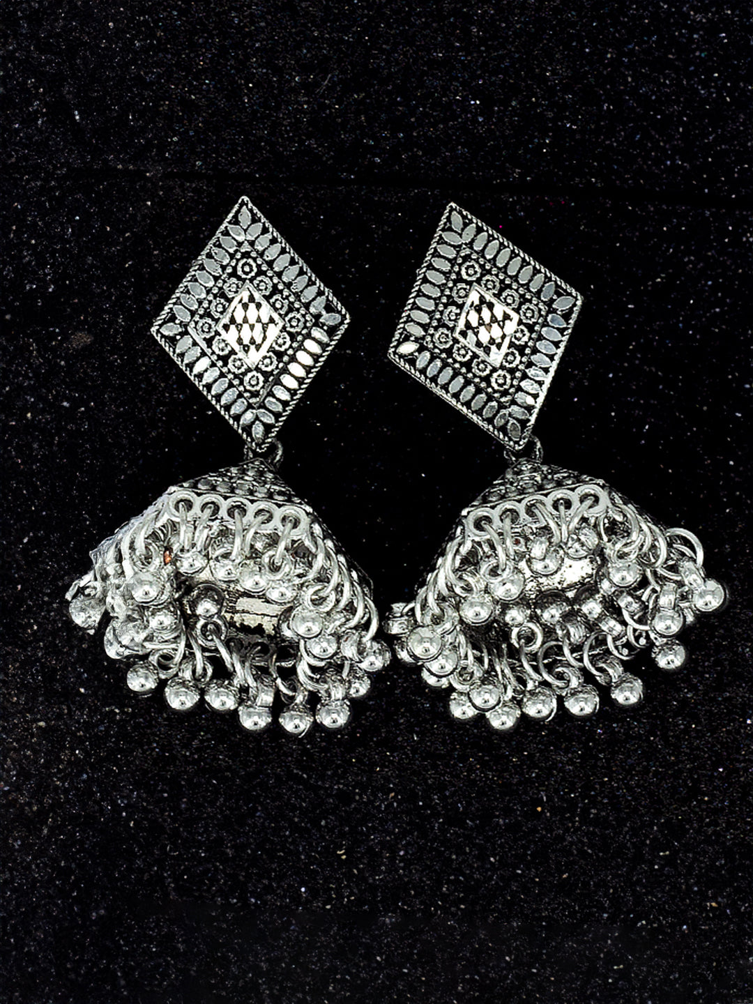 Silver Oxidised Jhumka Earrings, secured with post and back closure.