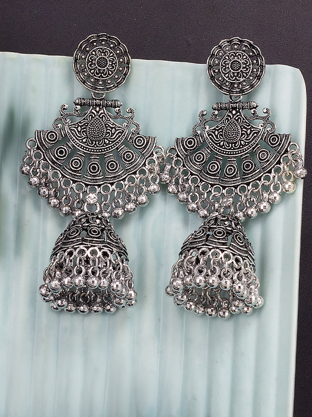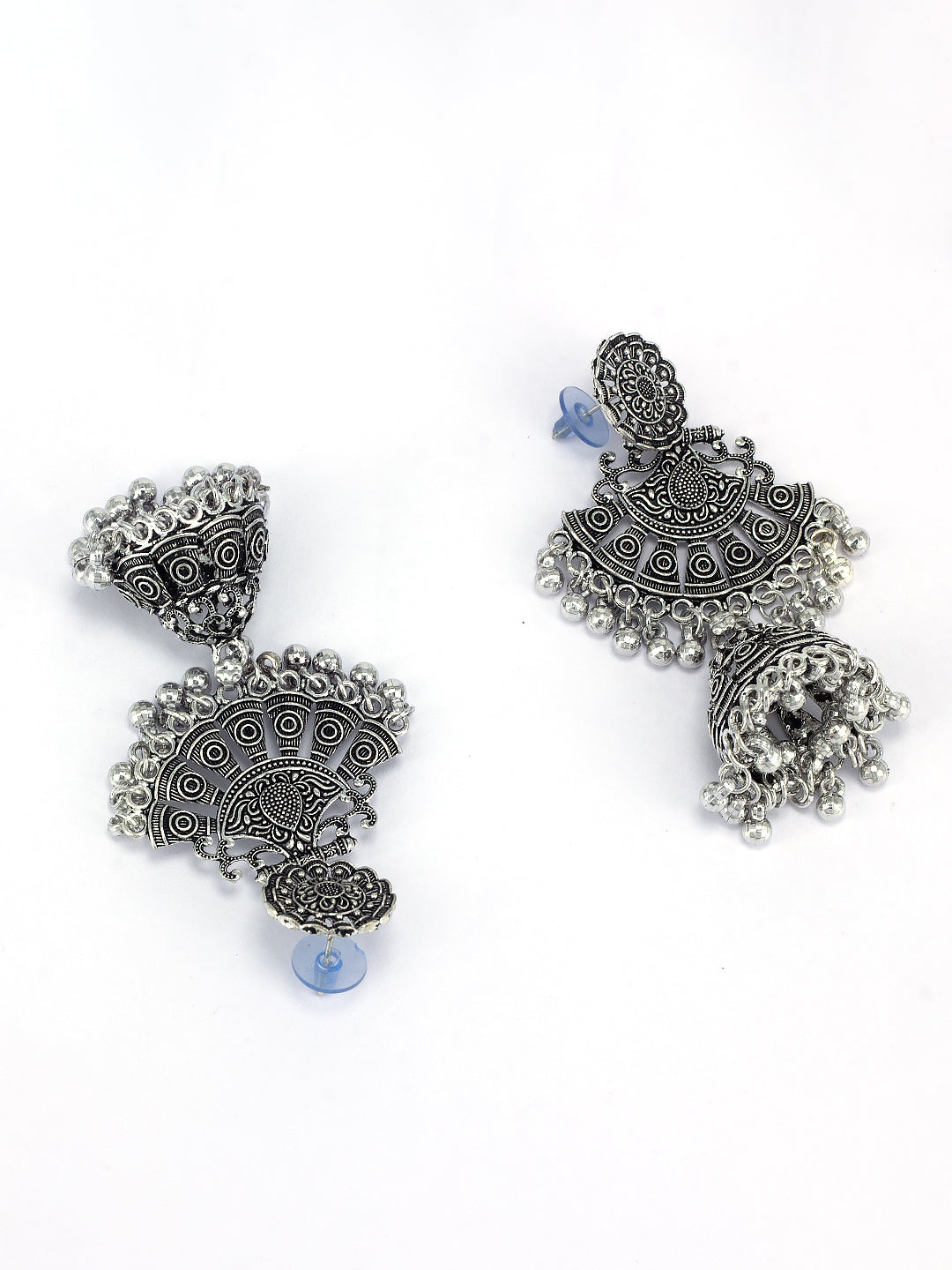 Silver Oxidised Jhumka Earrings, secured with post and back closure.