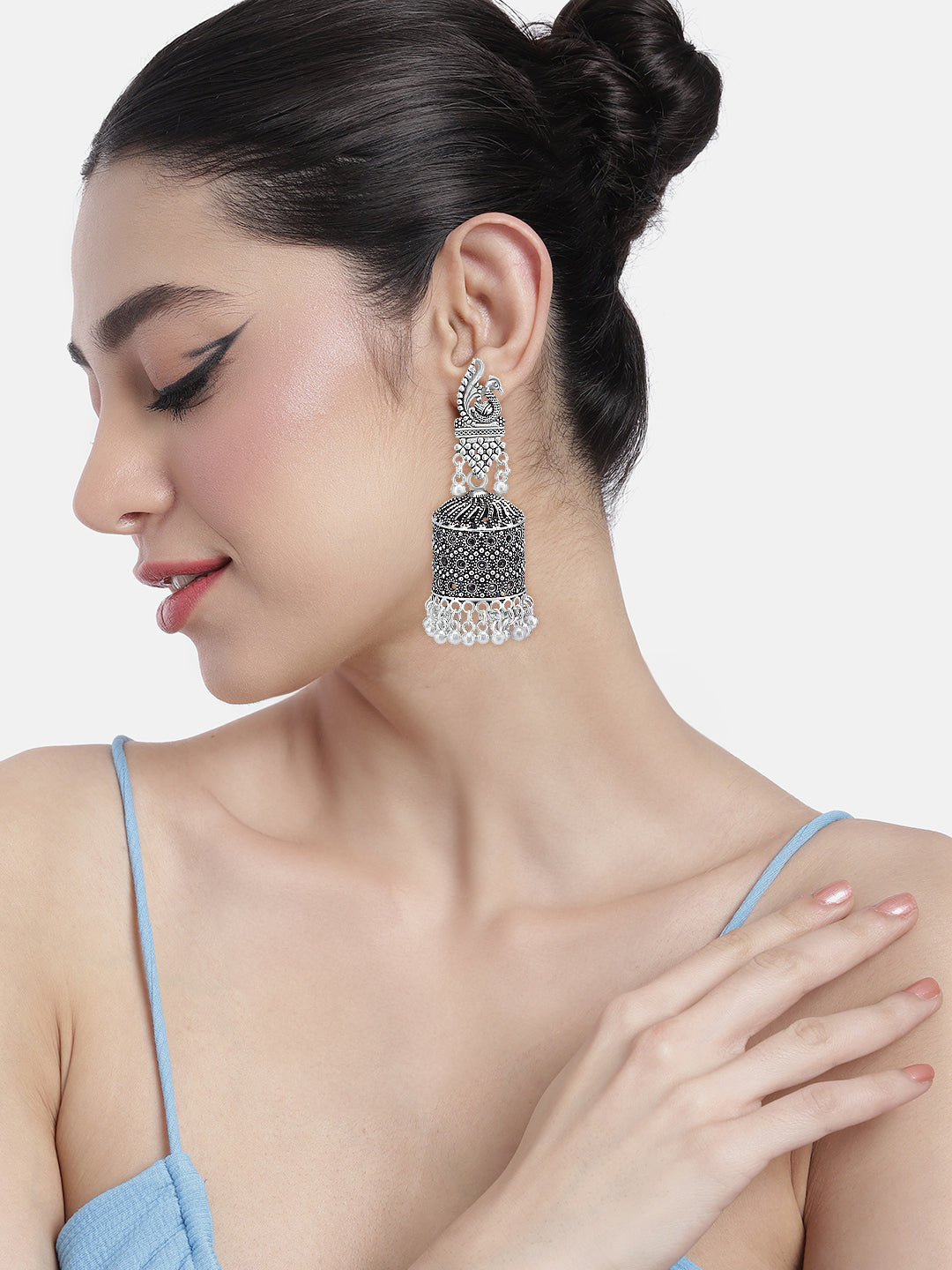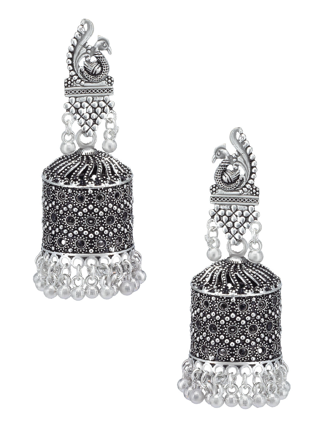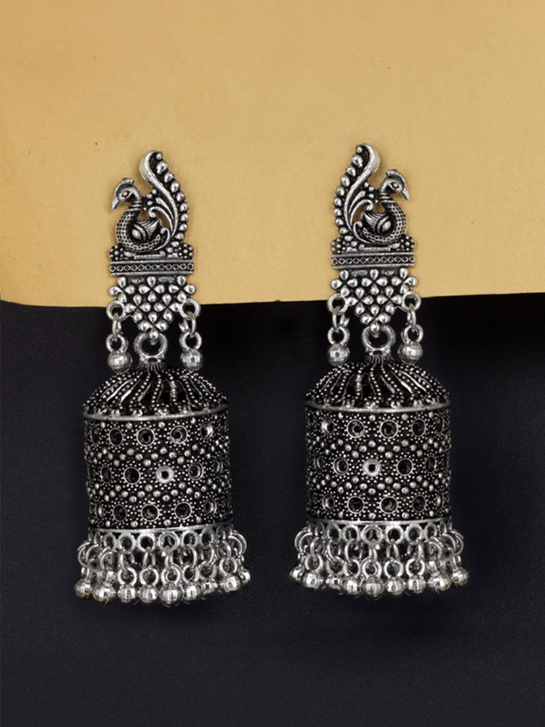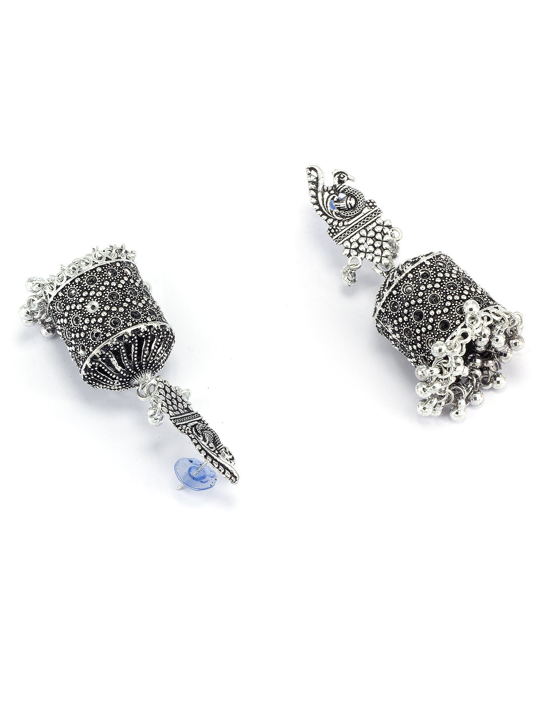 Silver Oxidised Peacock Jhumka Earrings, secured with post and back closure.