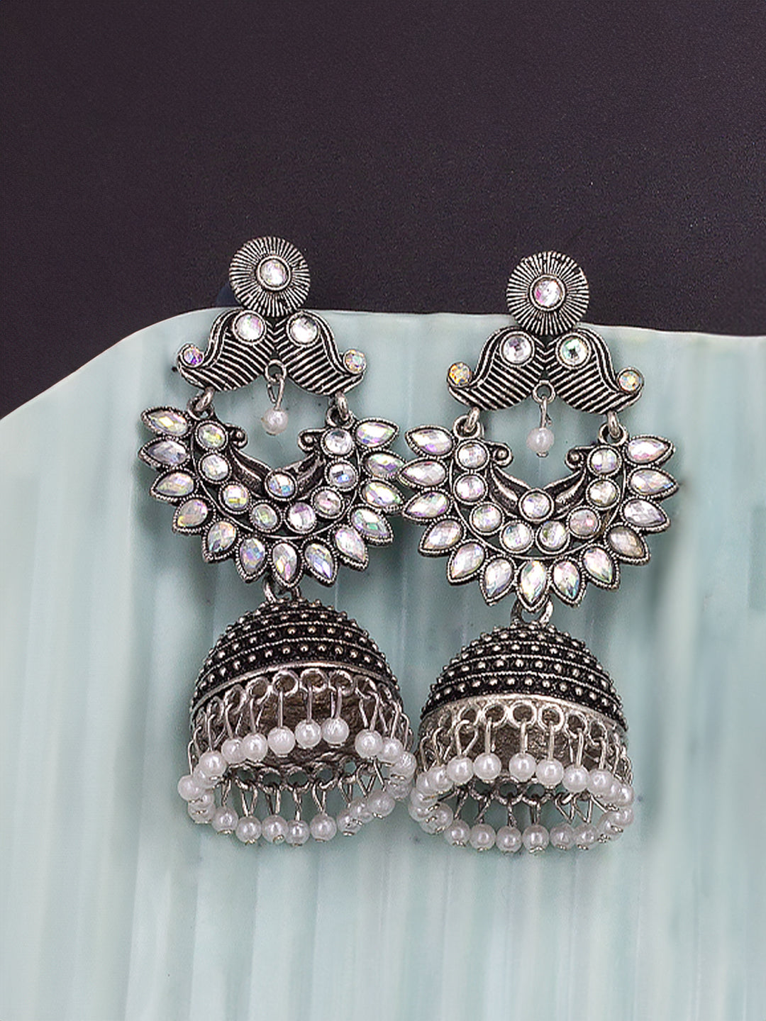 Silver Oxidised Floral & Artificial Beads Jhumka Earrings