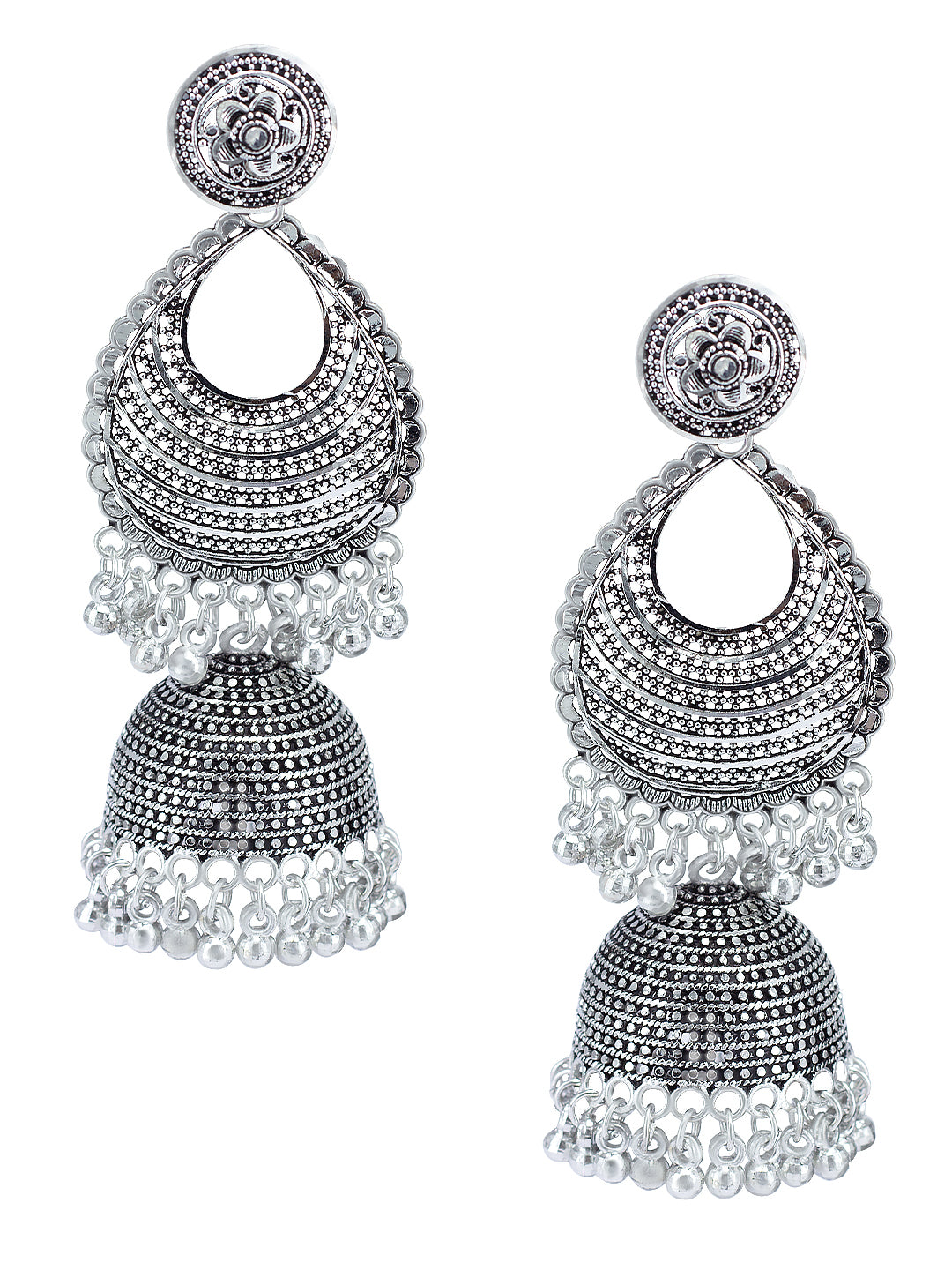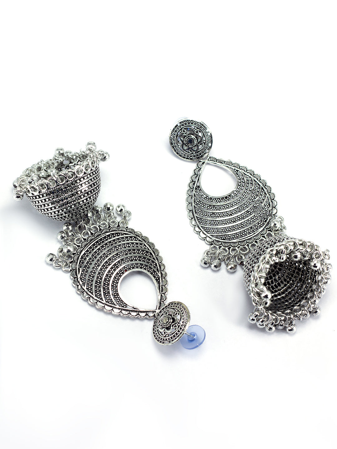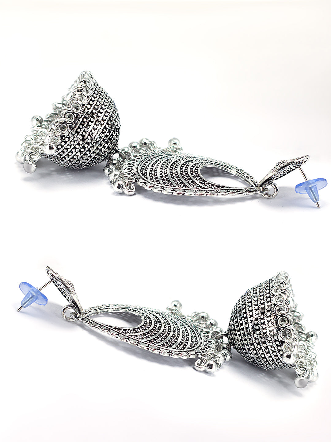 Silver Oxidised Jhumka Earrings, secured with post and back closure.