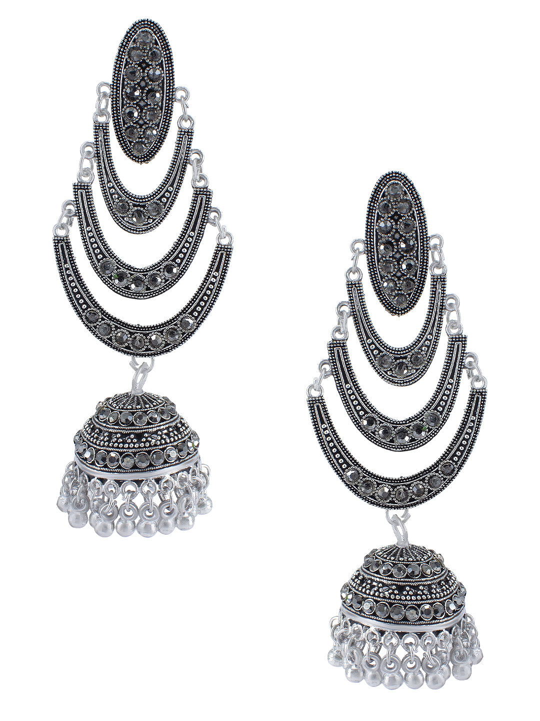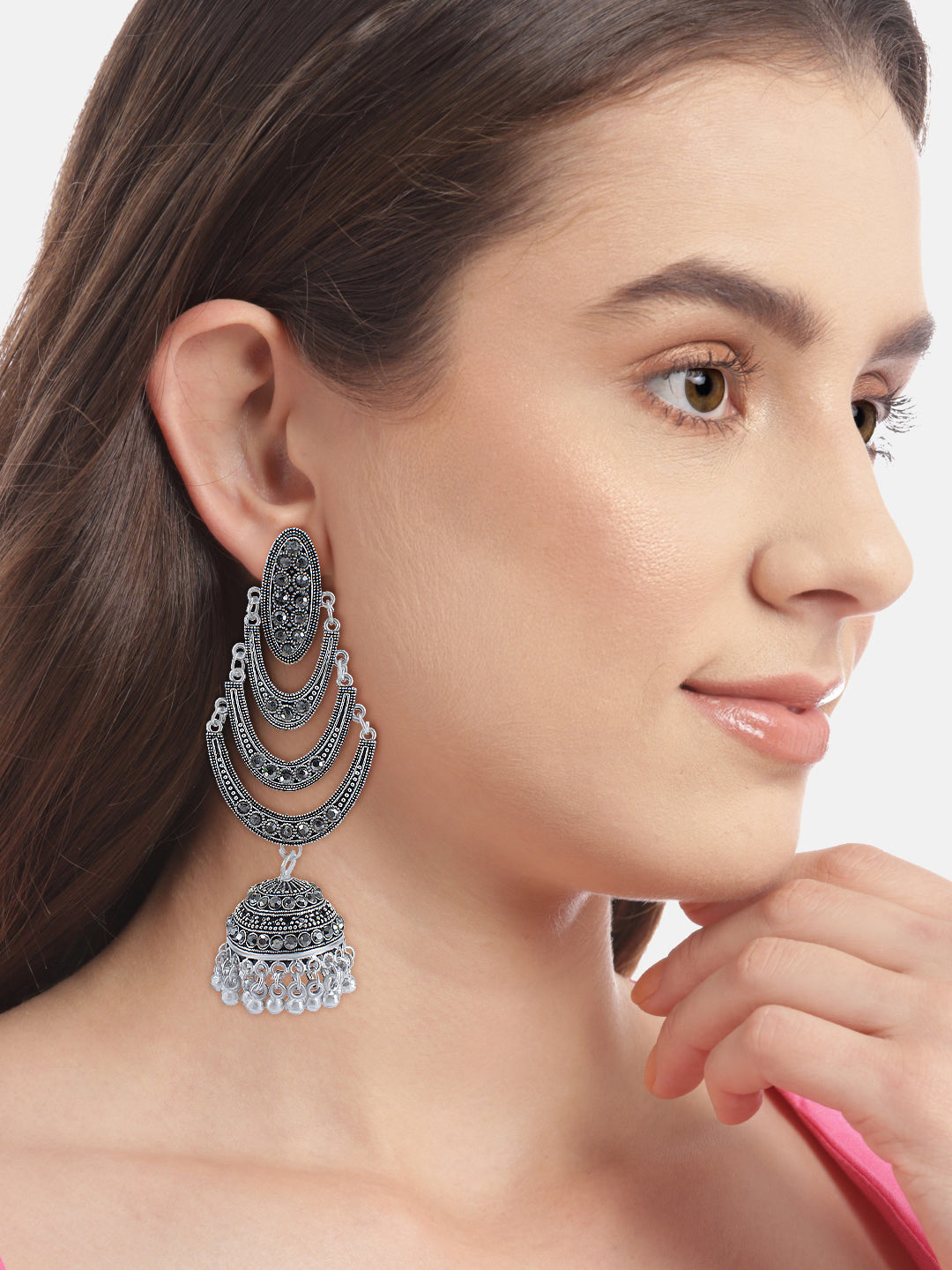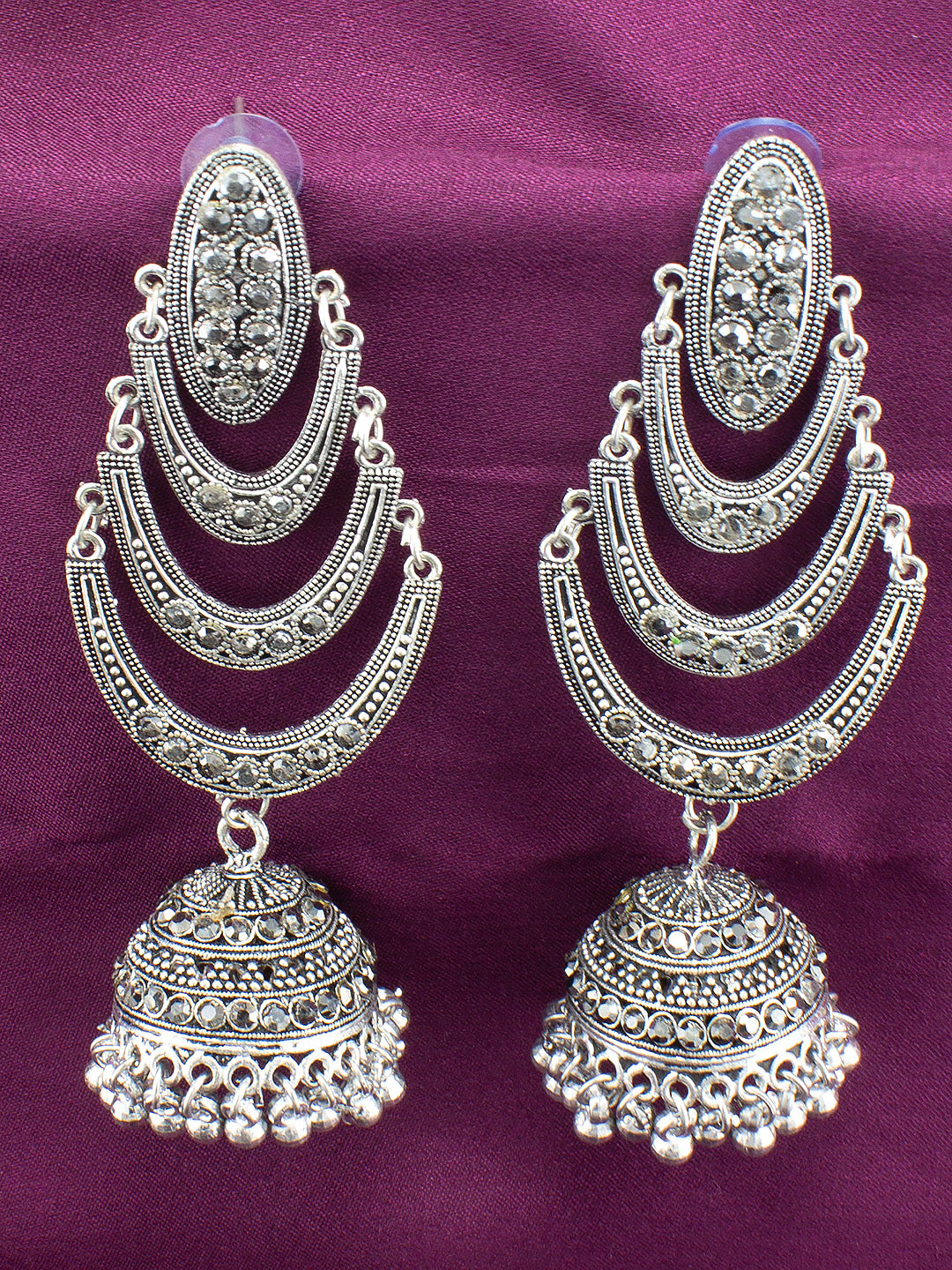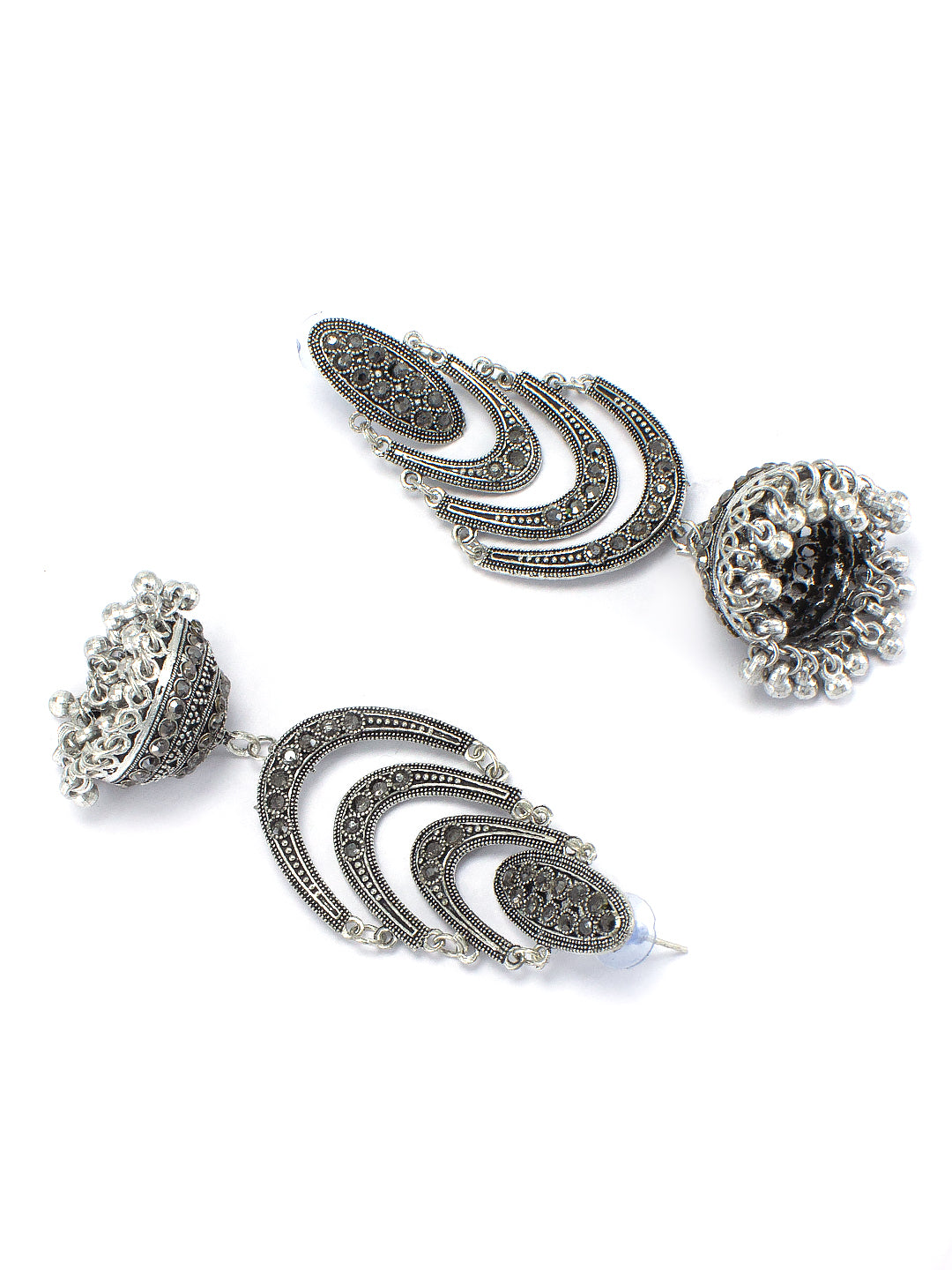 Silver Oxidised Chandbali Jhumka Earrings, secured with post and back closure.