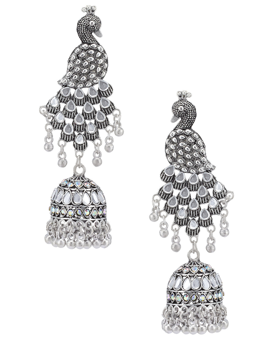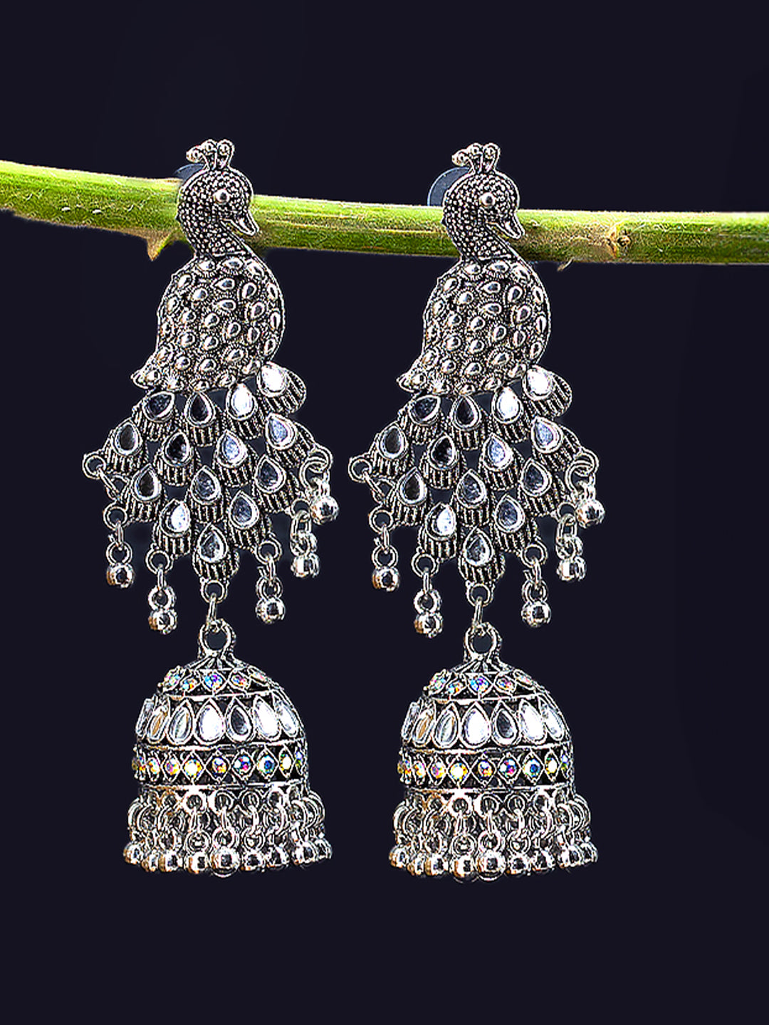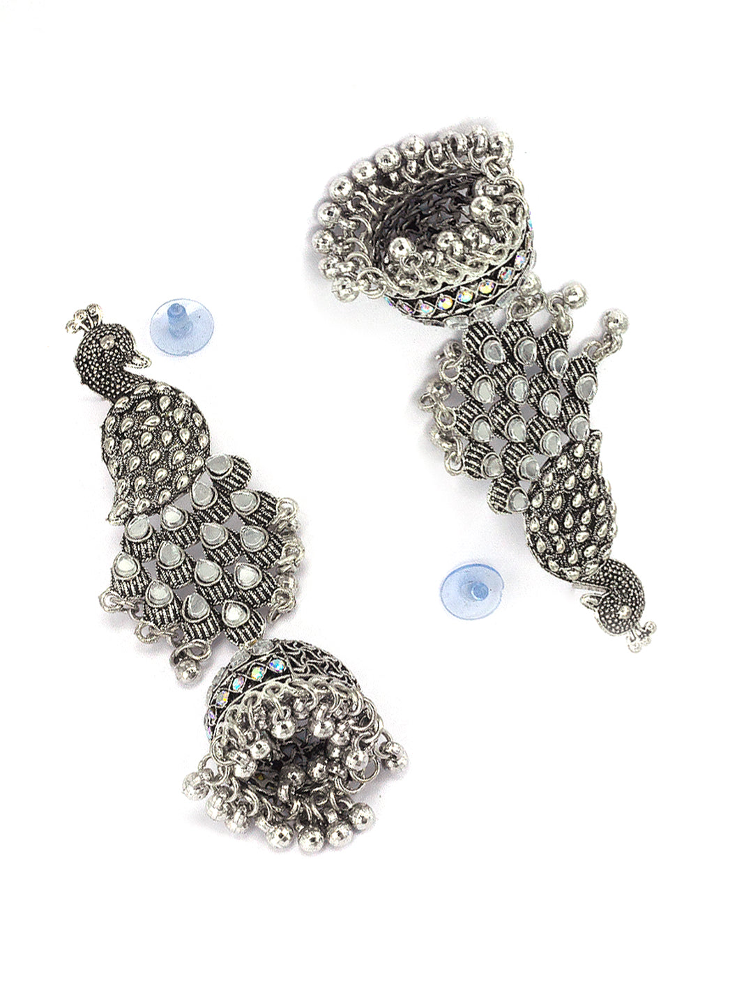 Silver Oxidised Peacock Jhumka Earrings, secured with post and back closure.
