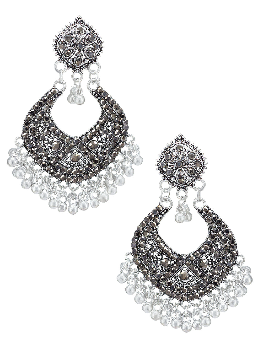 Silver Oxidised Chandbali Jhumka Earrings, secured with post and back closure.