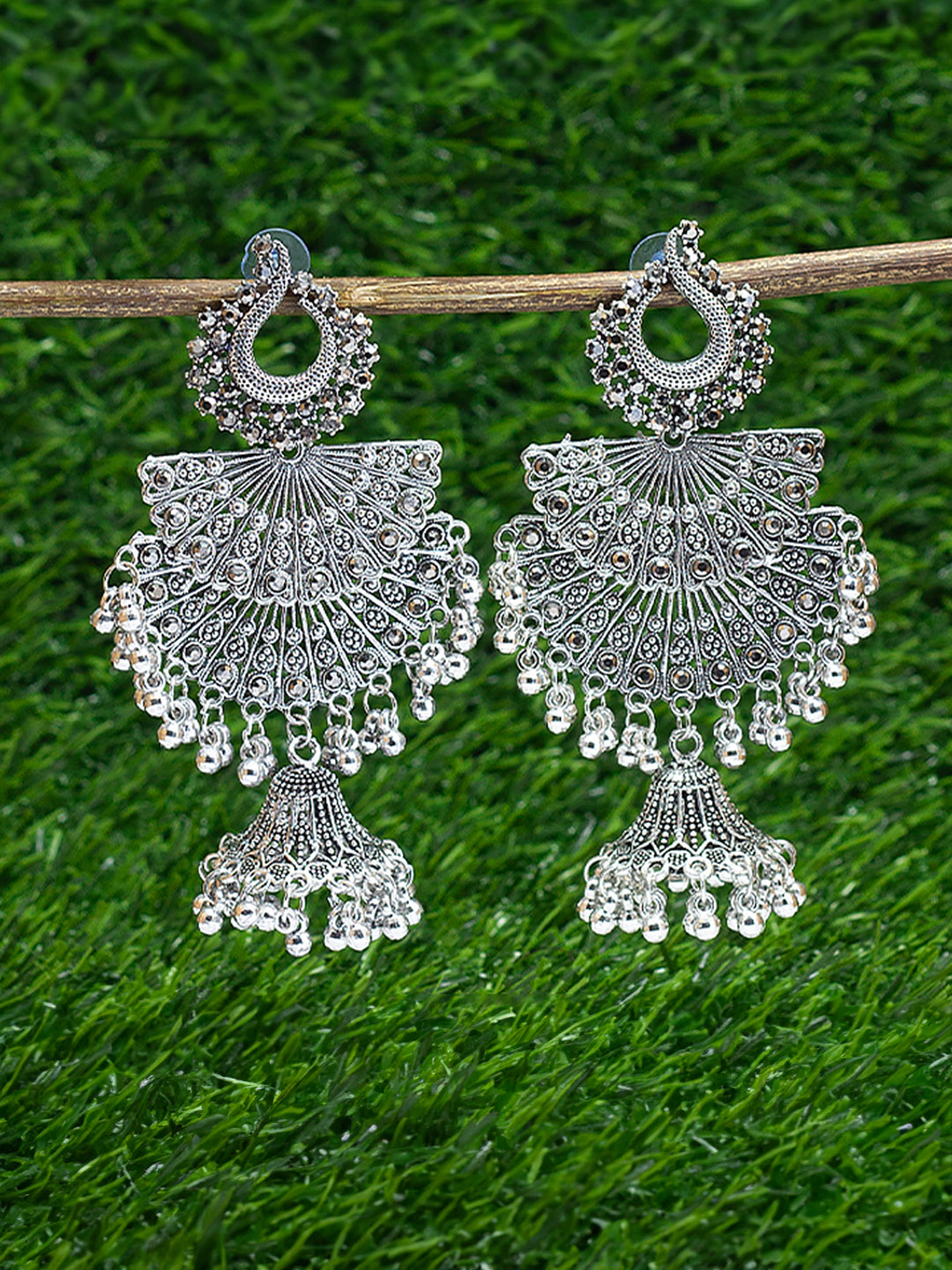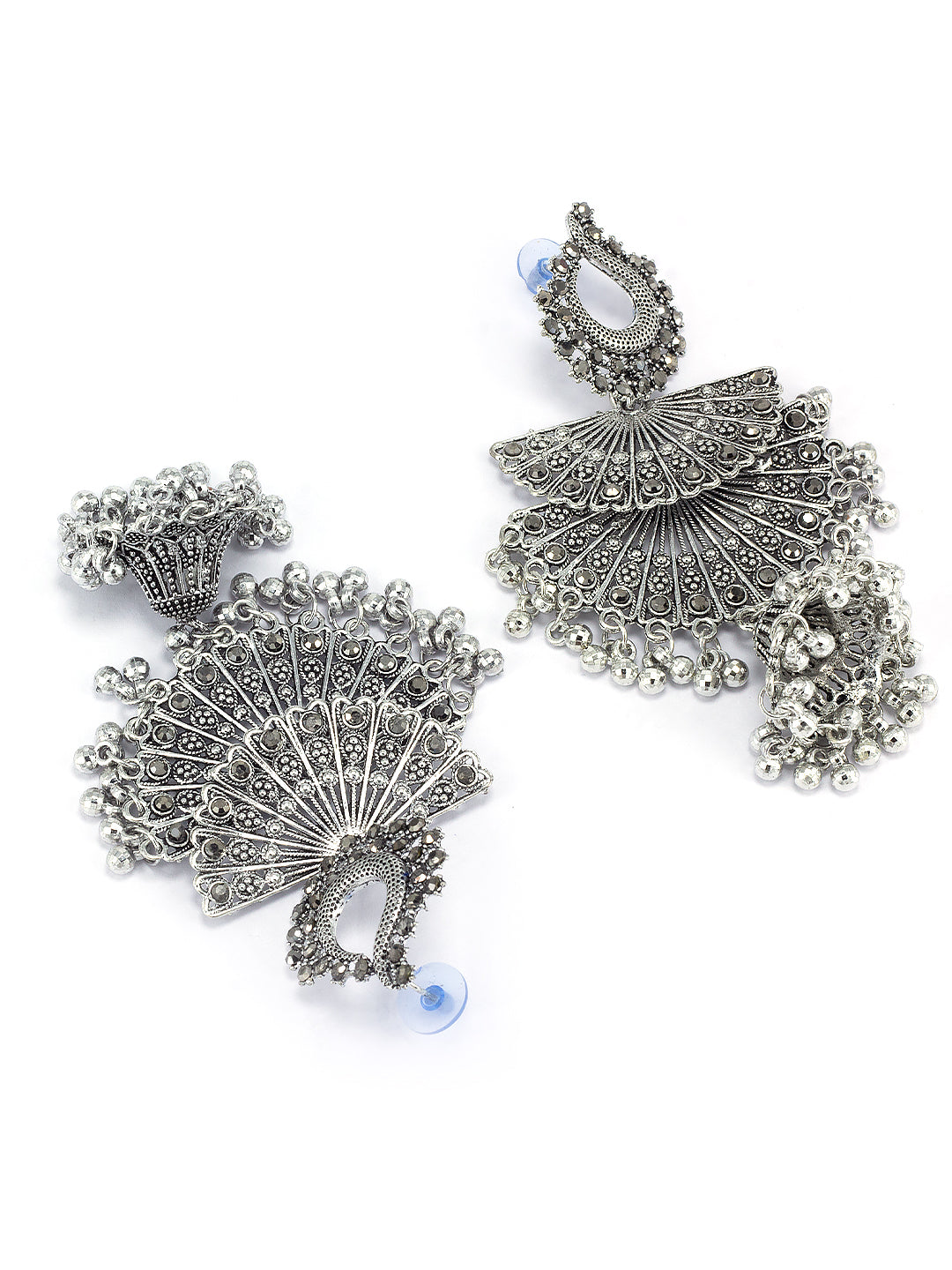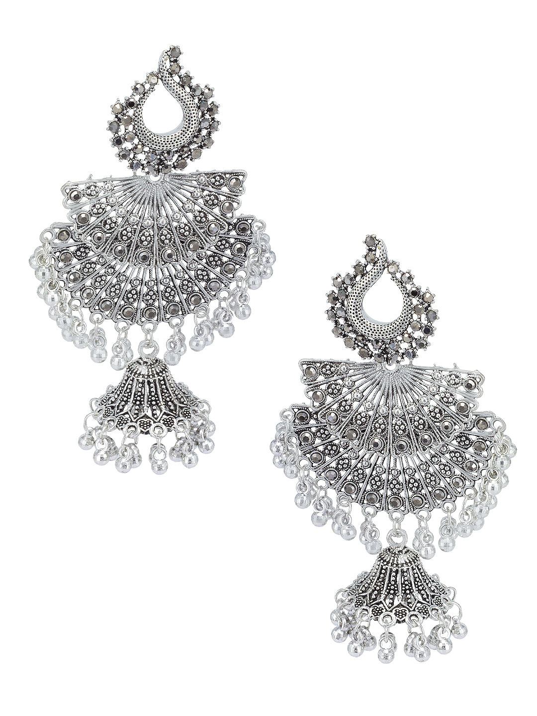 Silver Oxidised Afghani Jhumka Earrings, secured with post and back closure.
