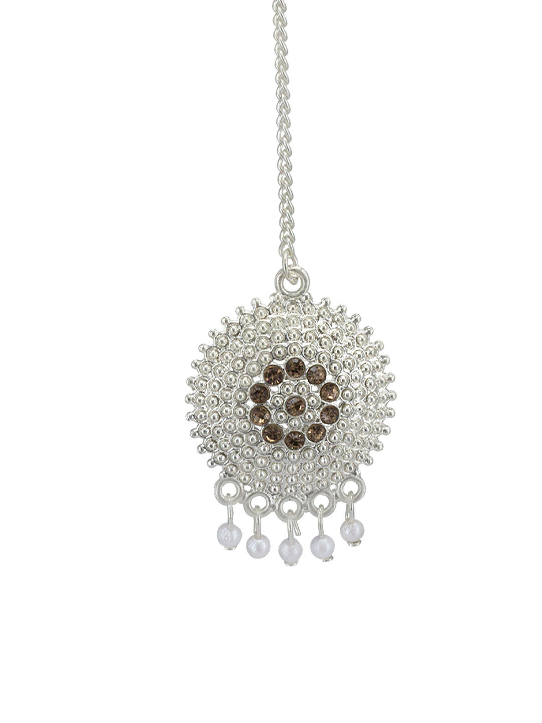 Silver Plated Artificial Stones & Beaded Jhumka Earrings With Mang Tika