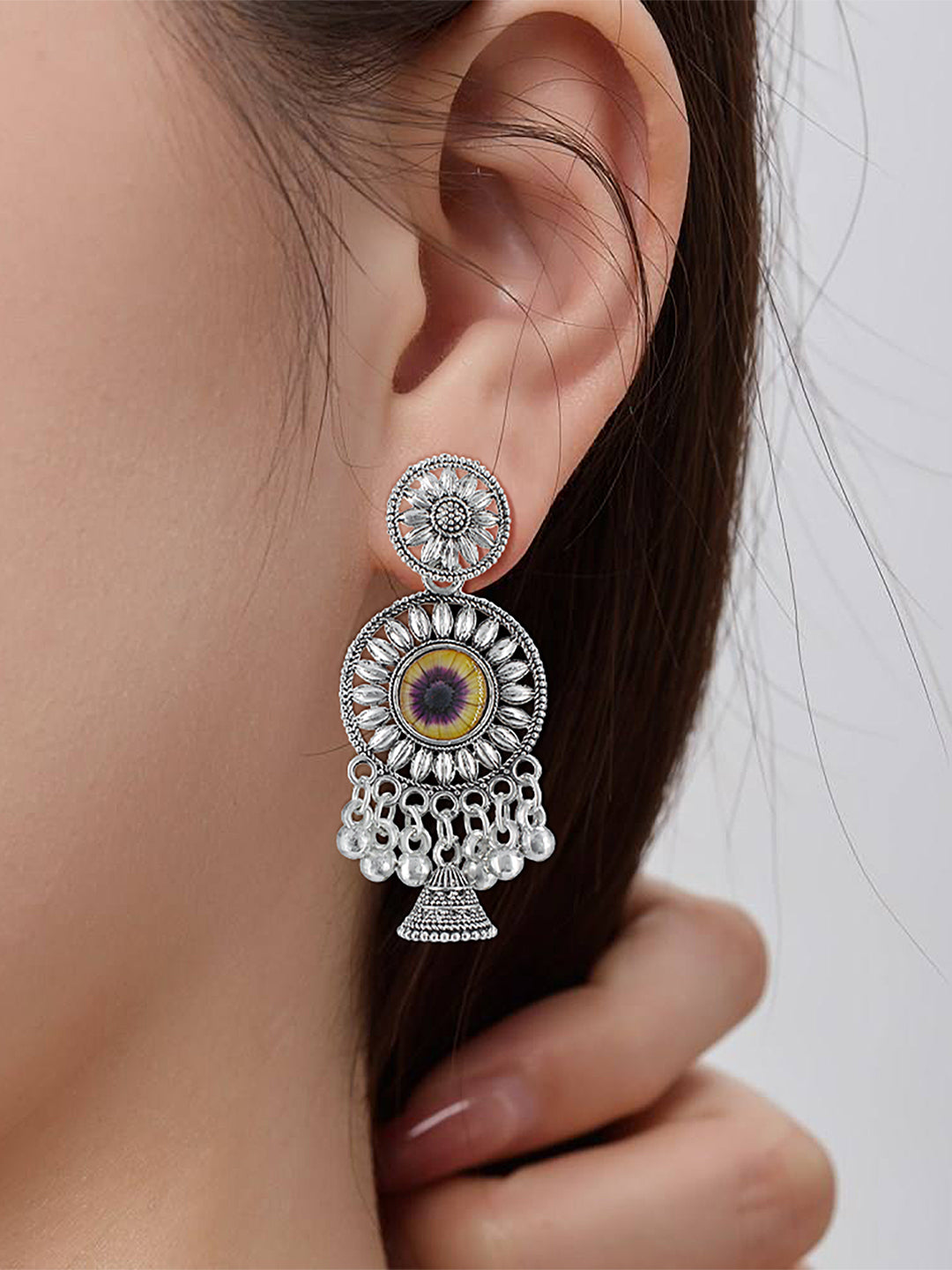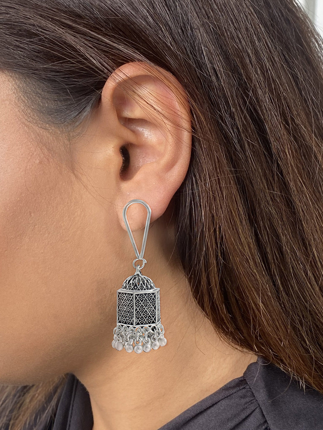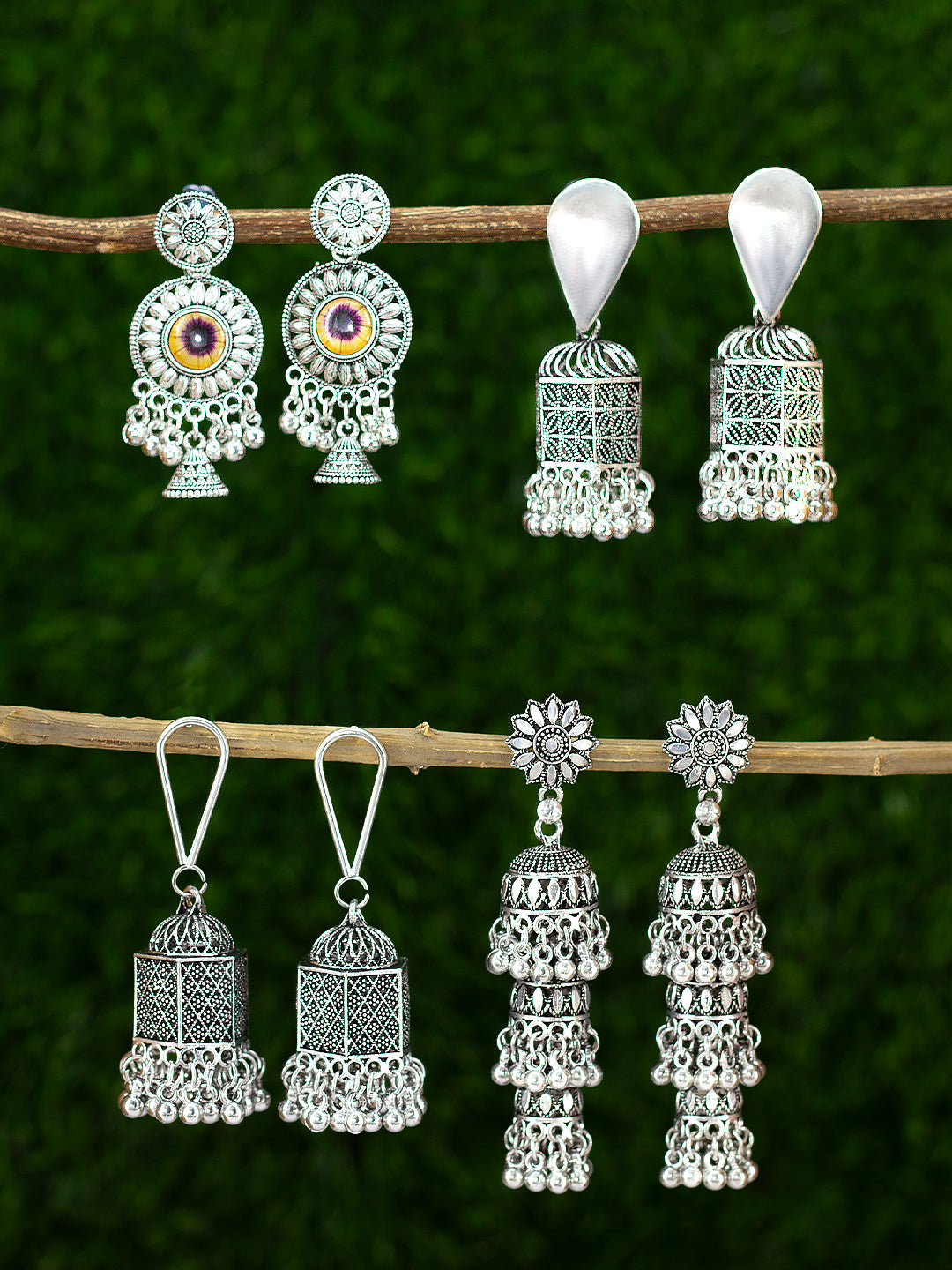 Pack of 4 Silver Oxidised Floral & Circular Jhumka Earrings