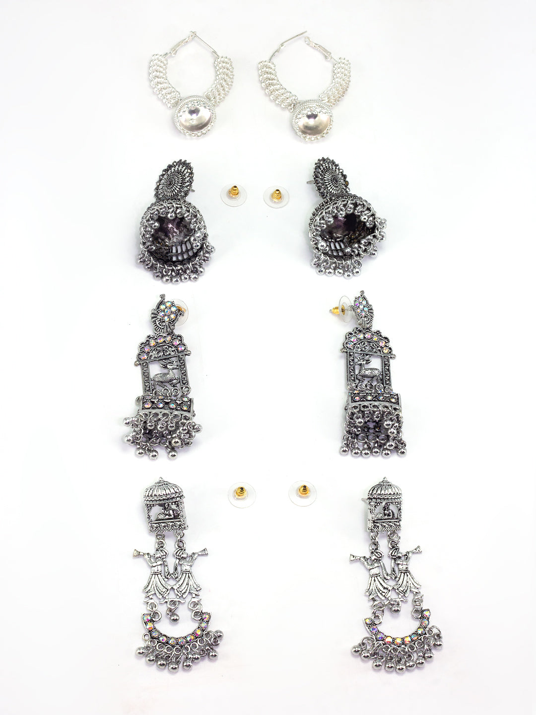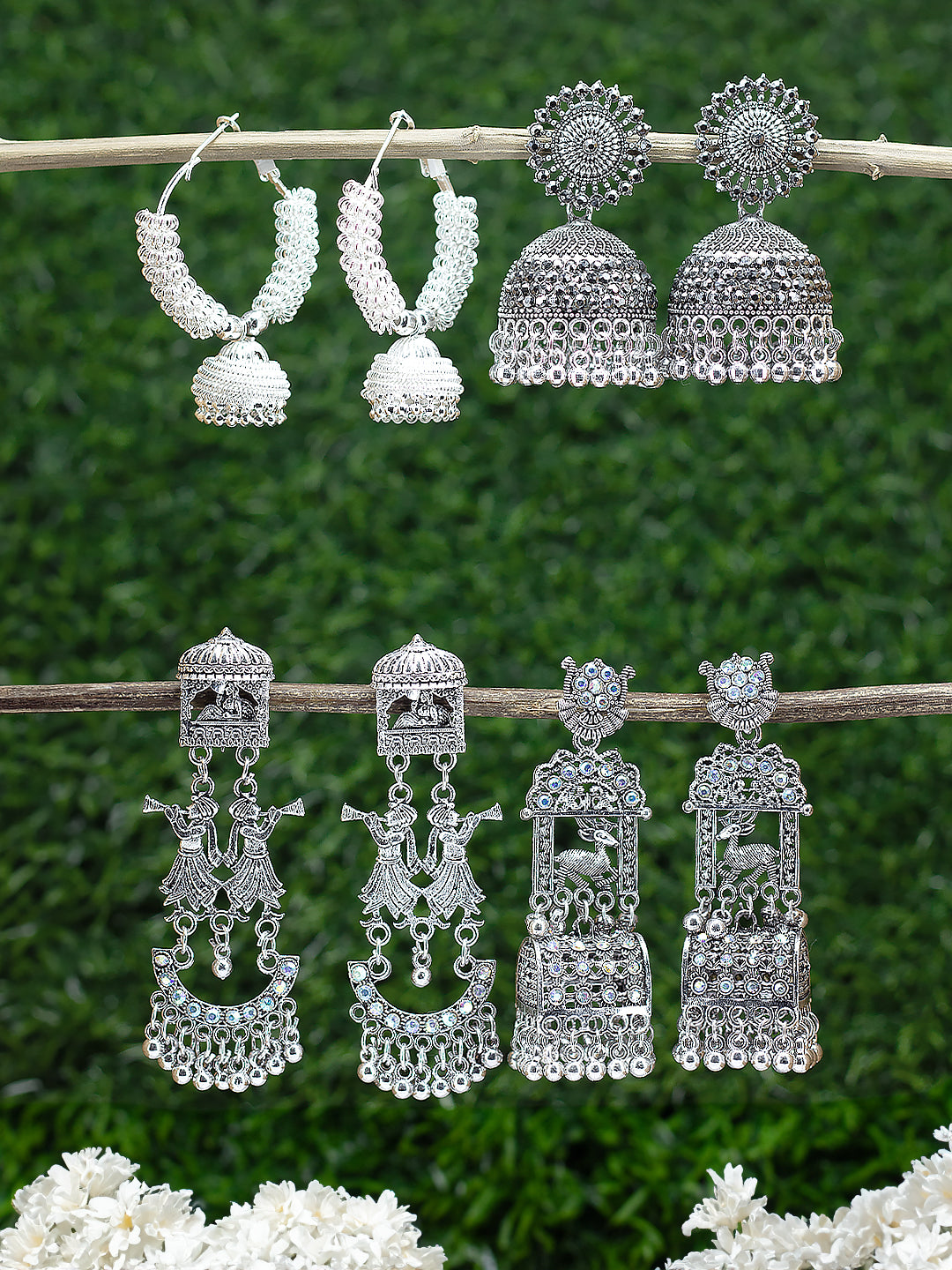 Pack of 4 Silver Plated Artificial Stones Studded Jhumka & Hoop Earrings