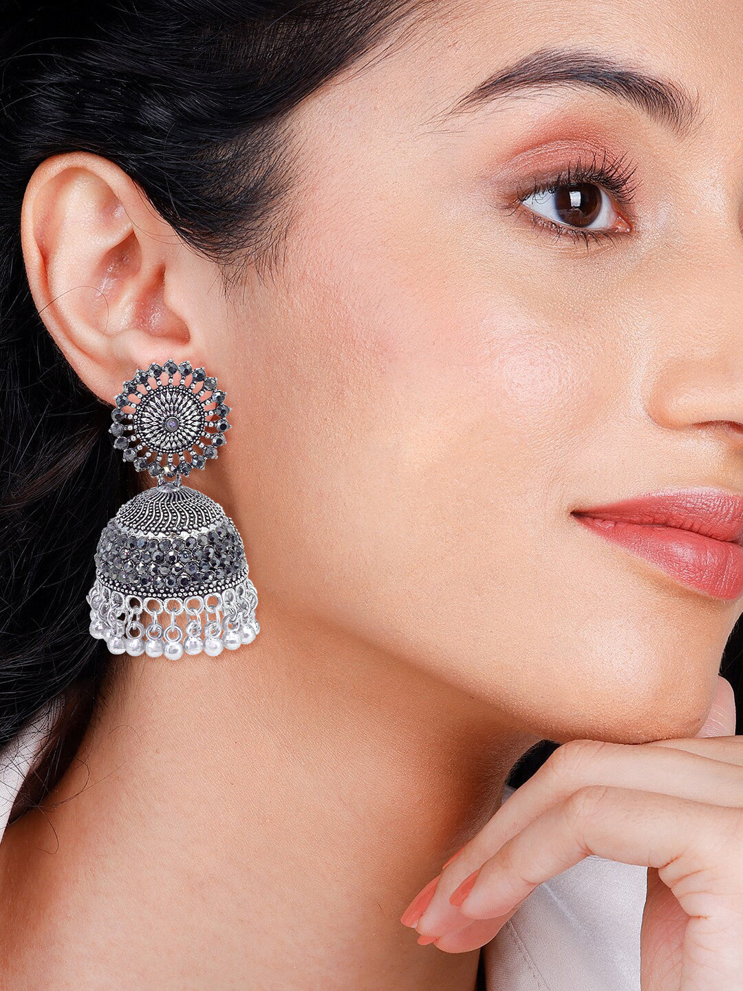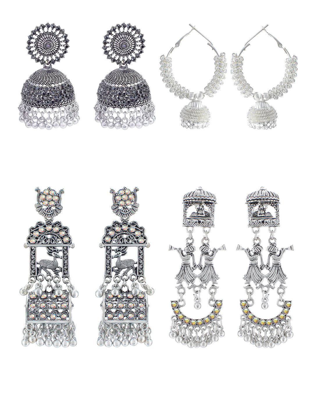 This set consist of 4 silver oxidised earrings artificial beads and stone studded and are secured with post and back closure.