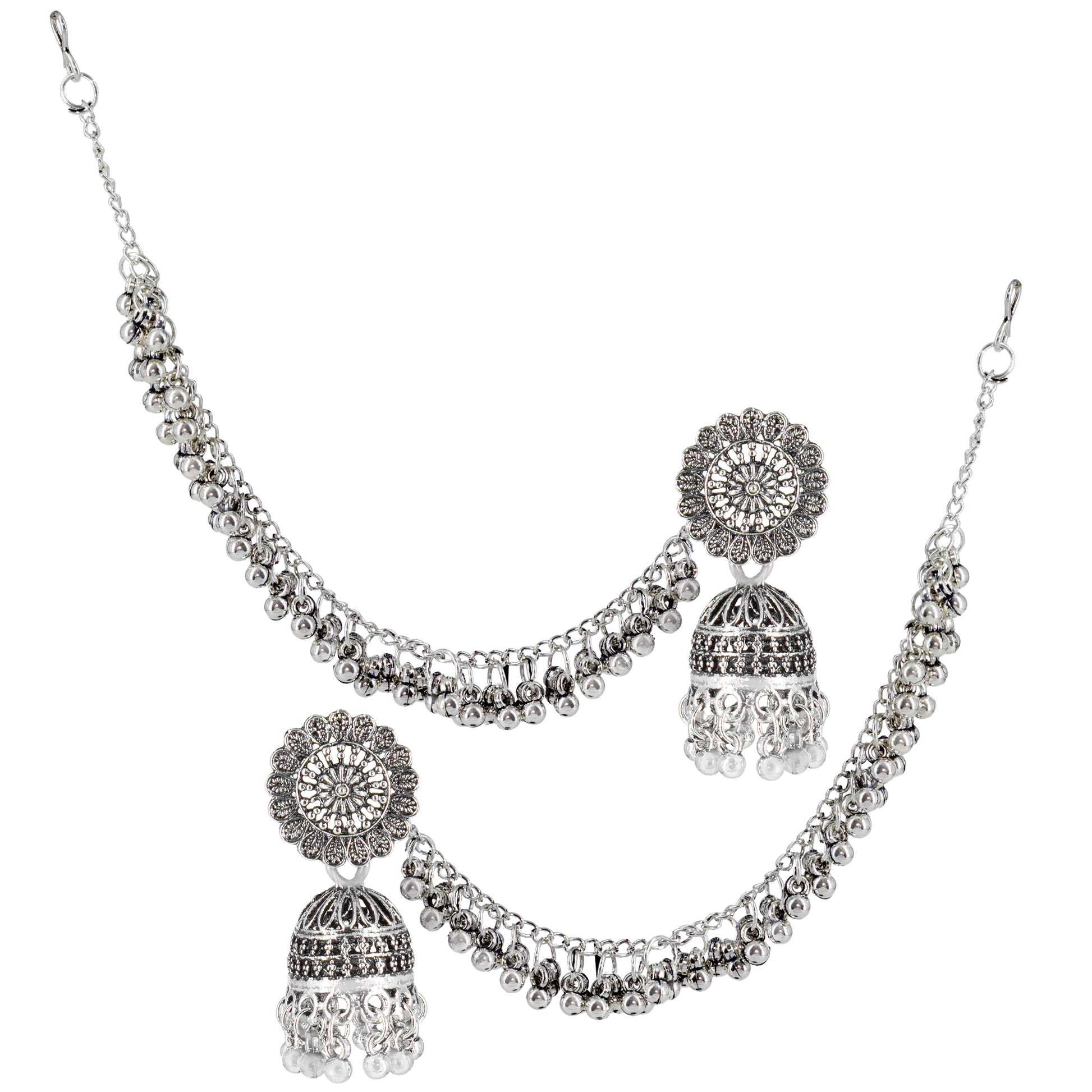 Silver-Oxidised Floral Jhumka Earrings With Ear Chain