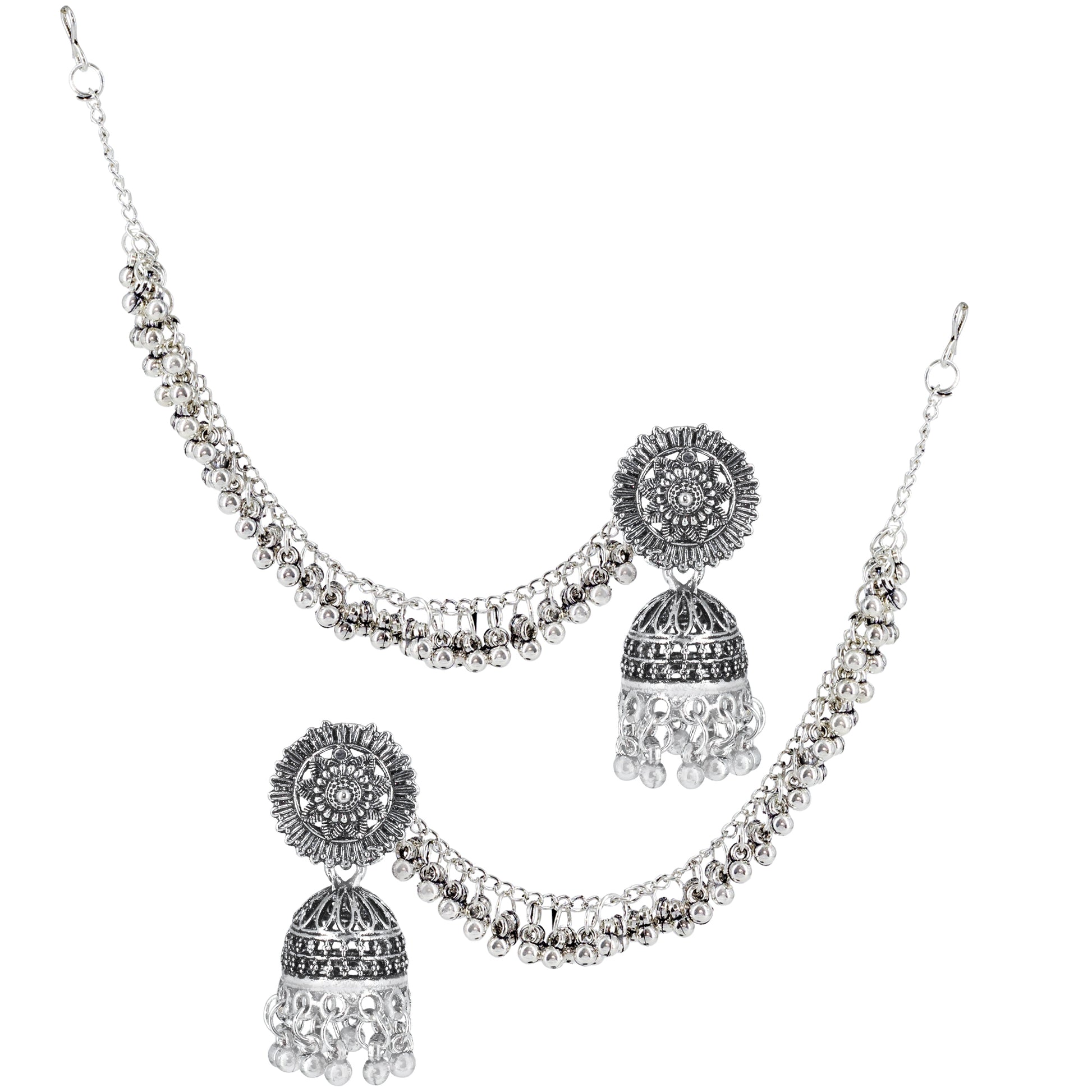 Silver-Oxidised Floral Jhumka Earrings With Hair Chain