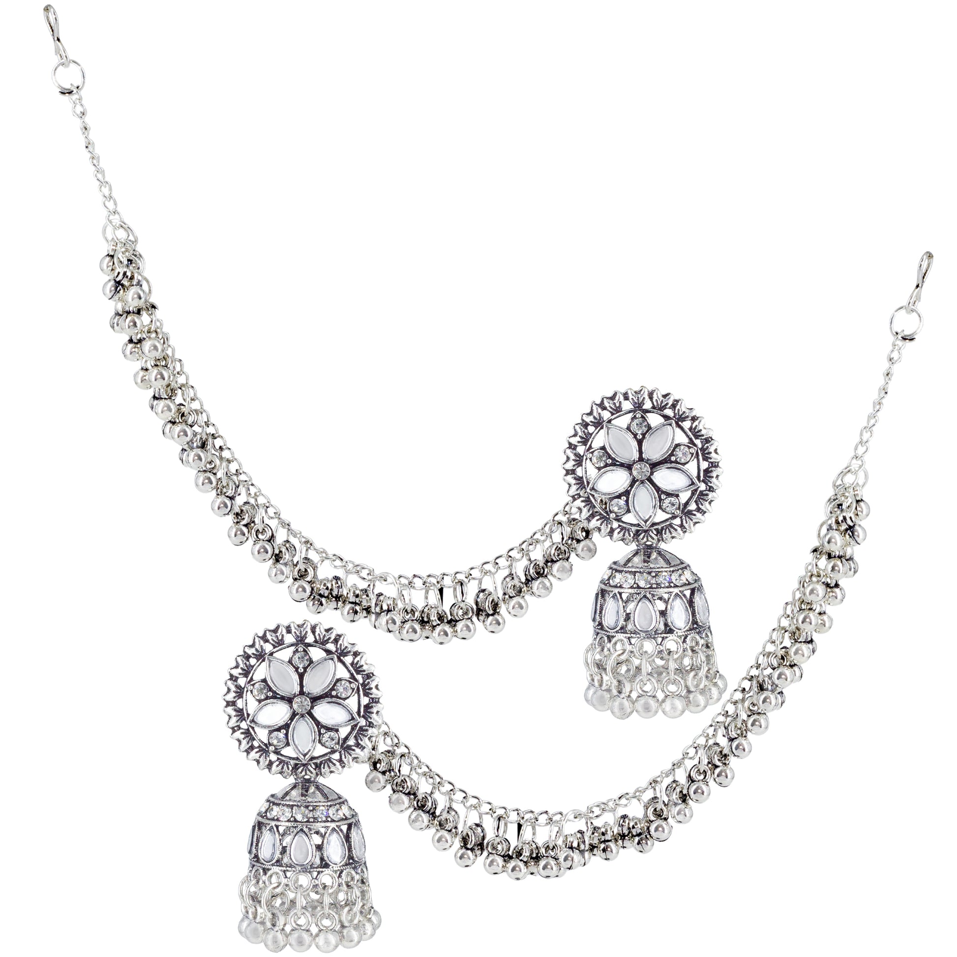 Silver-Oxidised Floral Mirror-Studded Jhumka Earrings With Hair Chain