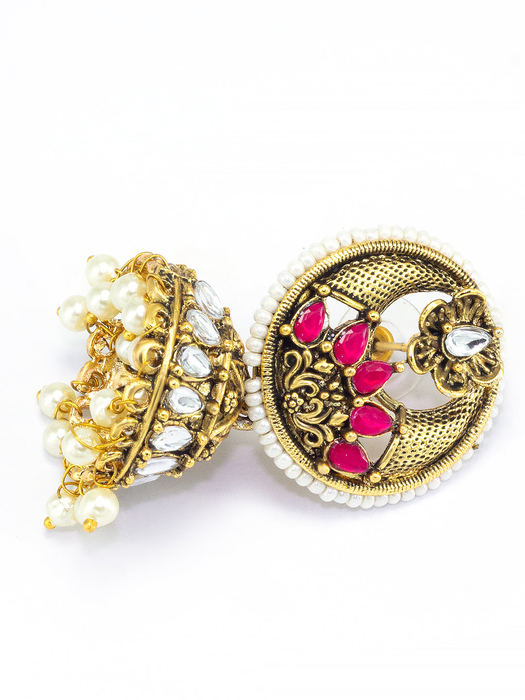 These earrings are gold plated, has stone and beads drop details and secured with post and back closure.