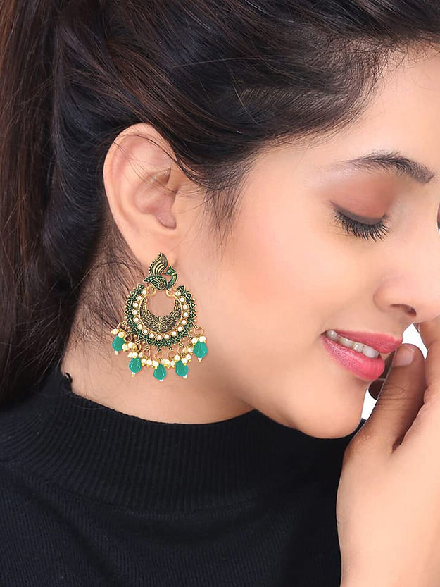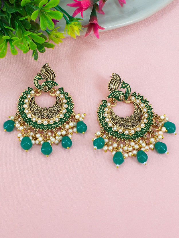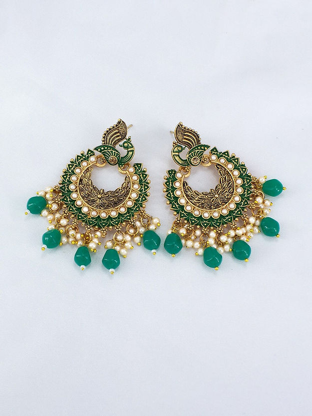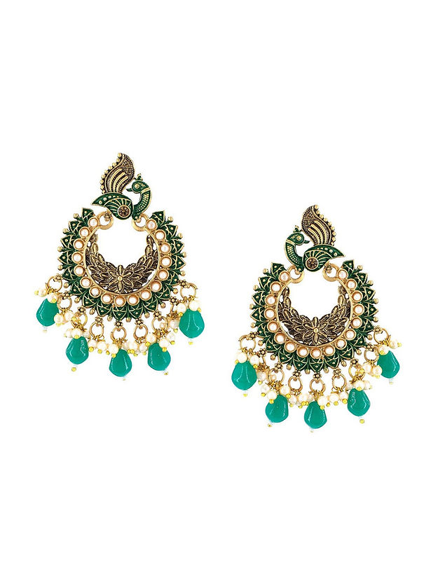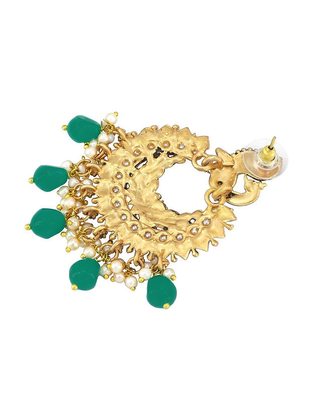 Green and gold-toned peacock shaped chandbalis, gold-plated, has artificial beads