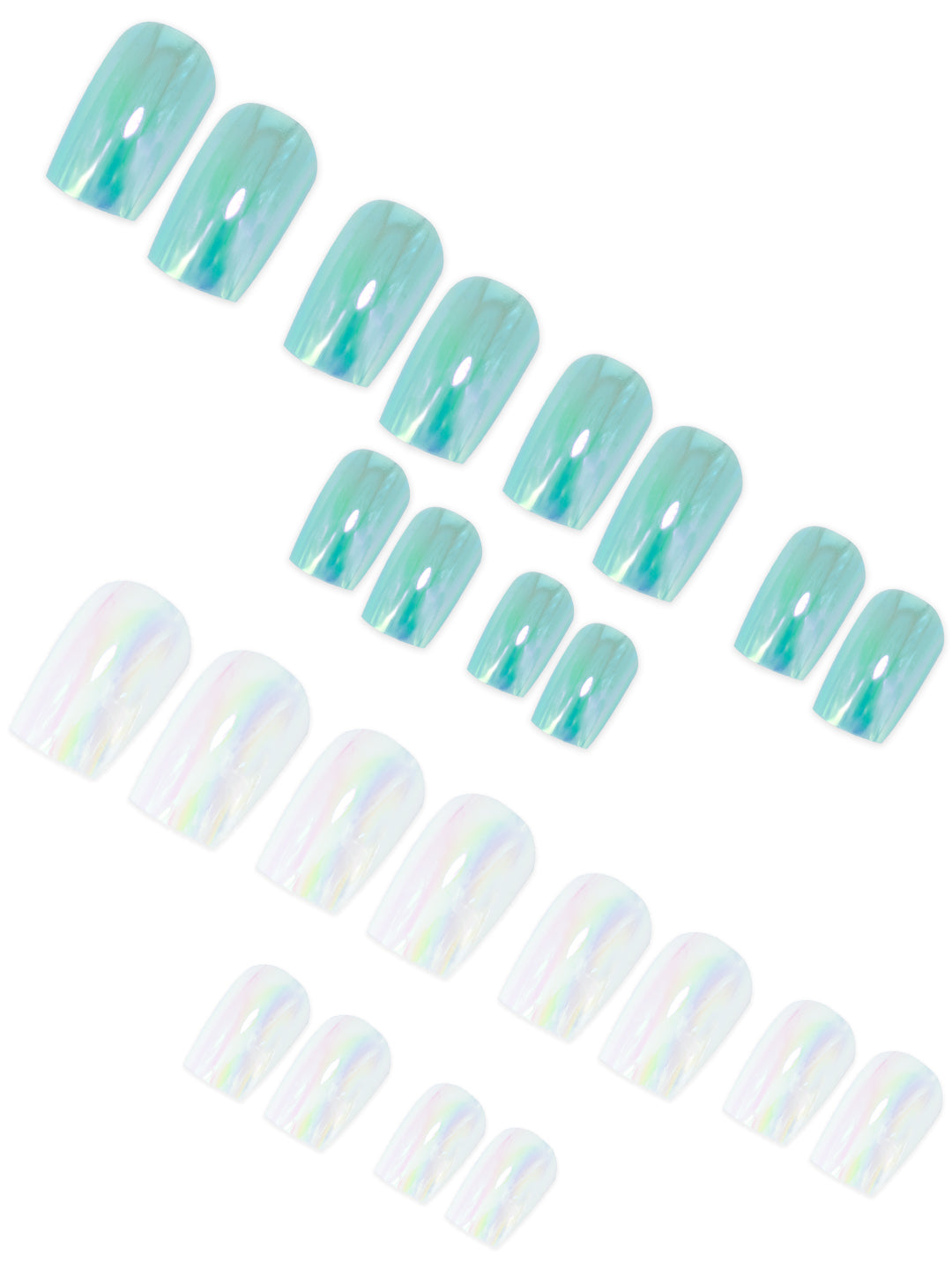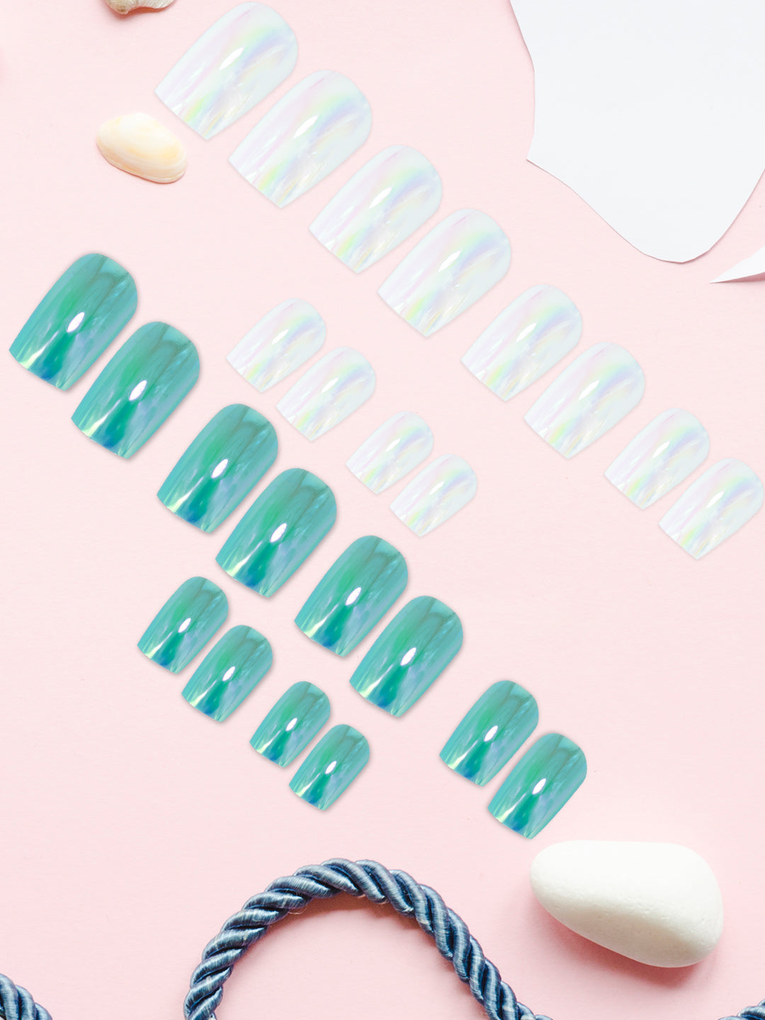 Set of 24 Sea Green and White Metallic Duochrome stick on nails