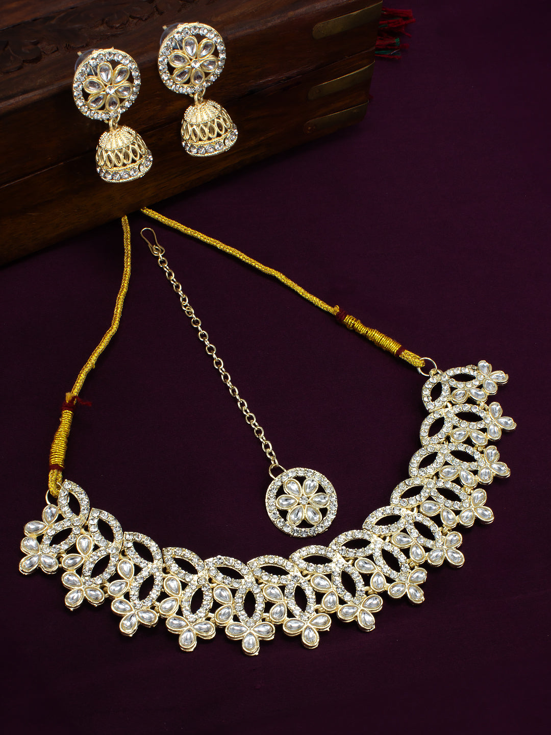 This set consists of a gold plated necklace, a pair of earrings and a matching maangtika, has cz studded details and secured with drawstring closure, earrings are secured with post and back closure and maangtika is secured with hook closure.