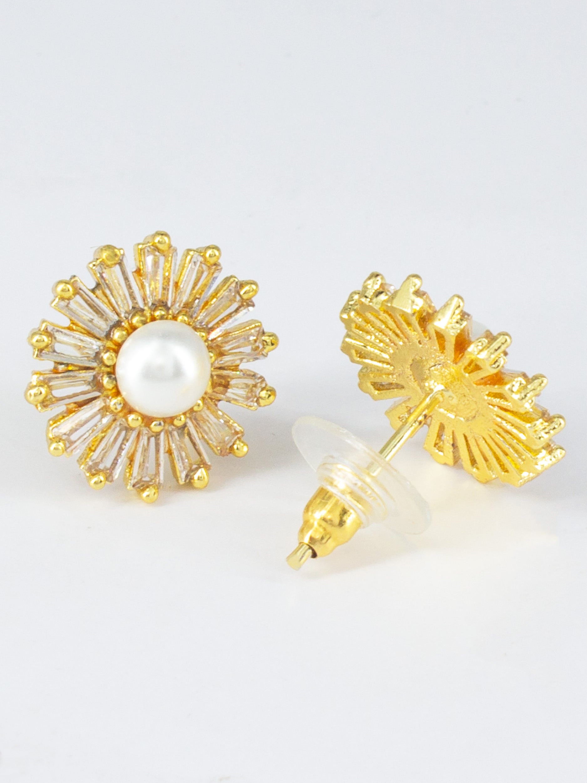 Gold Plated American Diamond with Faux Pearl Studded Floral Stud Earrings with Post & Back Closure.