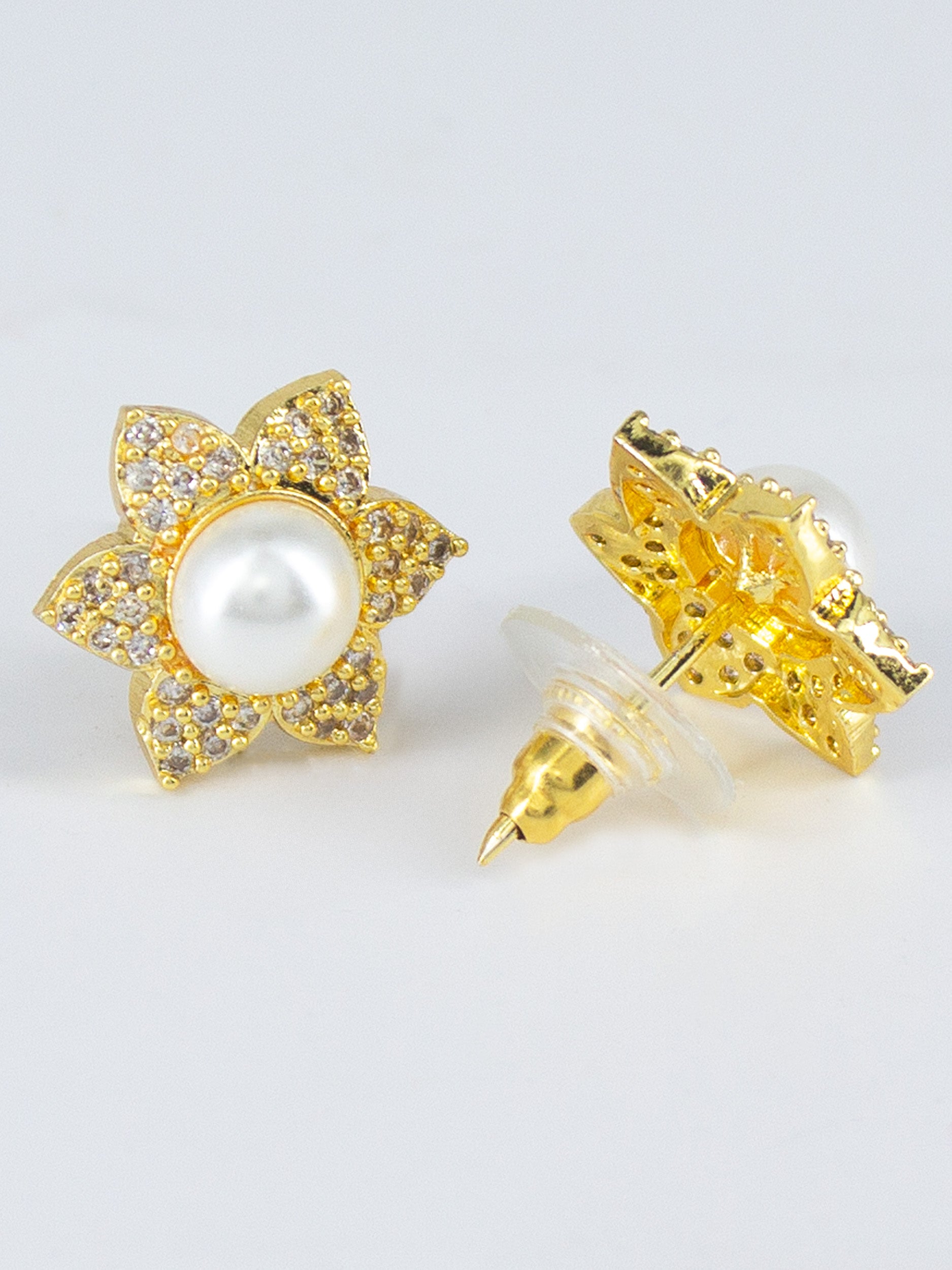 Gold Plated American Diamond with Faux Pearl Studded Floral Stud Earrings with Post & Back Closure.