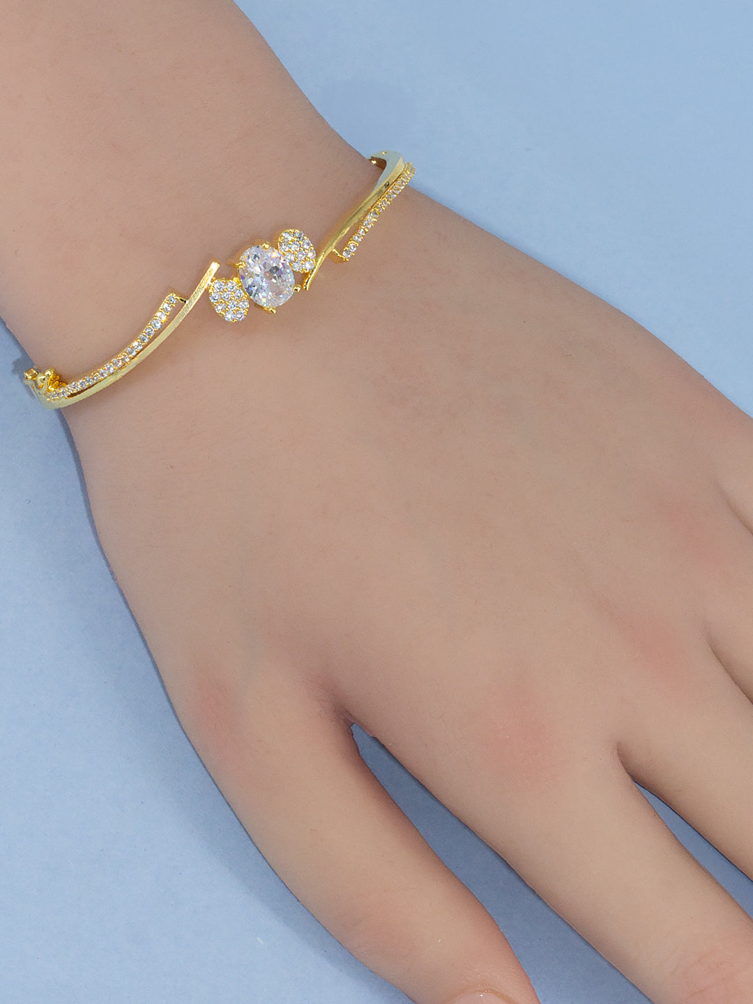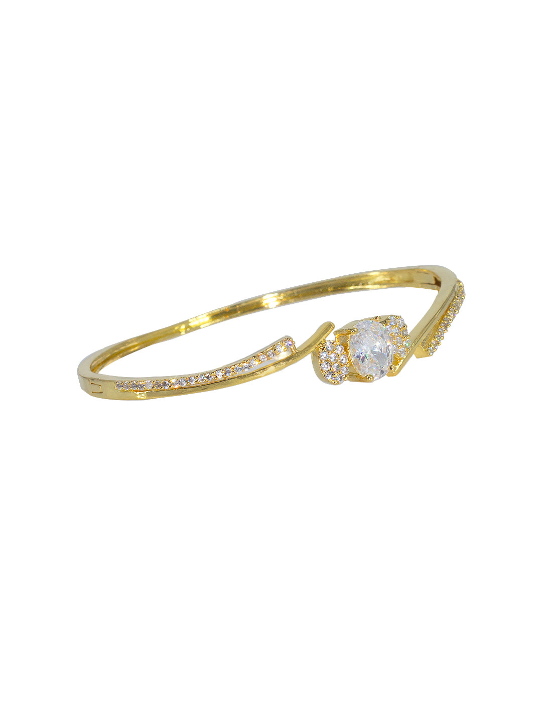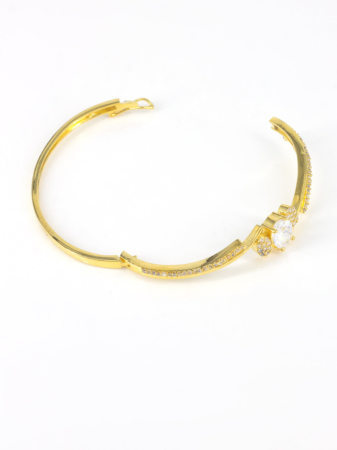 This bracelet is gold plated, has American Diamond studded details and secured with slip on and interlock closure.