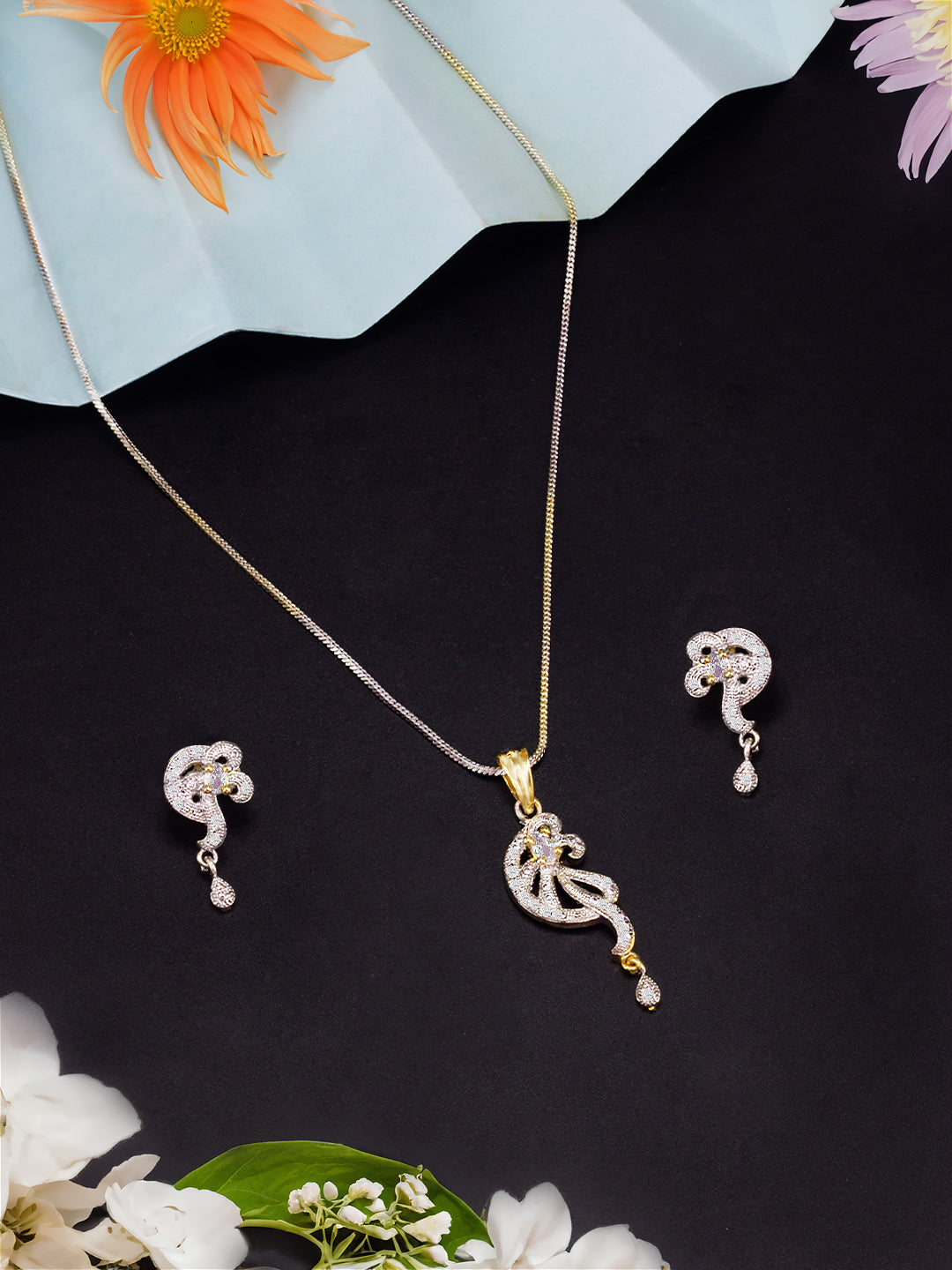 Rhodium Plated Teardrop American Diamond Studded Trendy Pendant Set