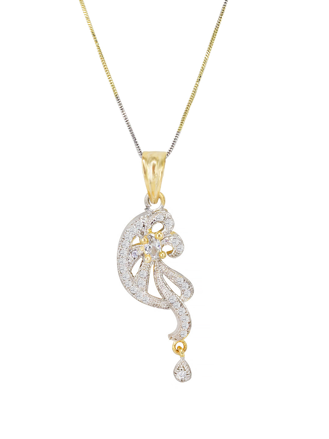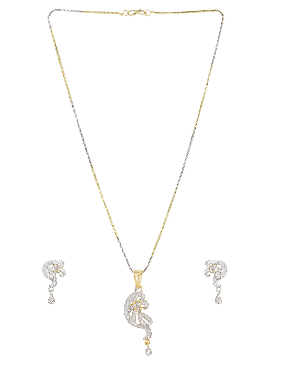 This pendant set consist of a pendant with chain and a pair of earrings. Pendant with chai has AD studded details and secured with s-hook closure. Earrings are secured with post and back closure.