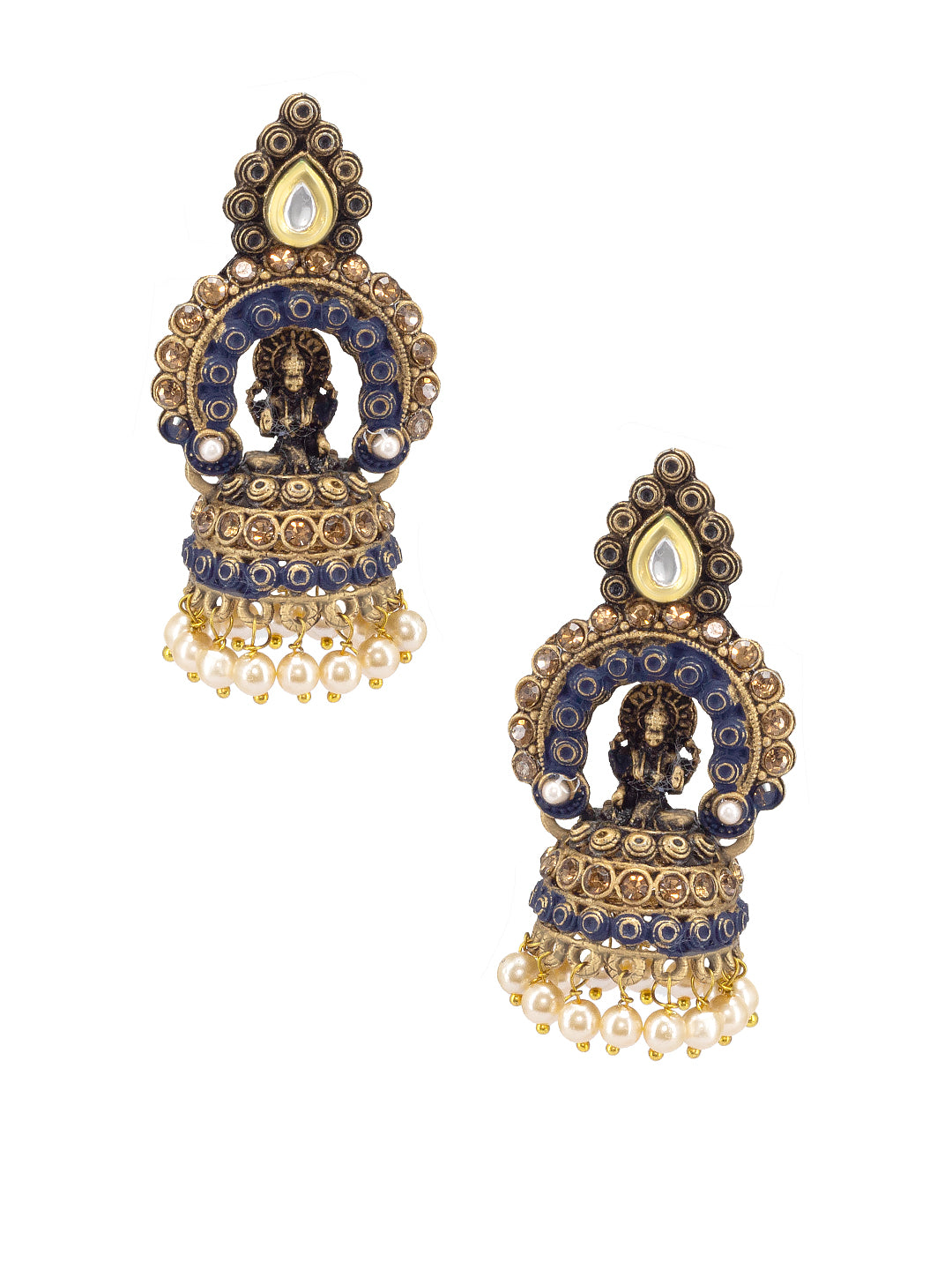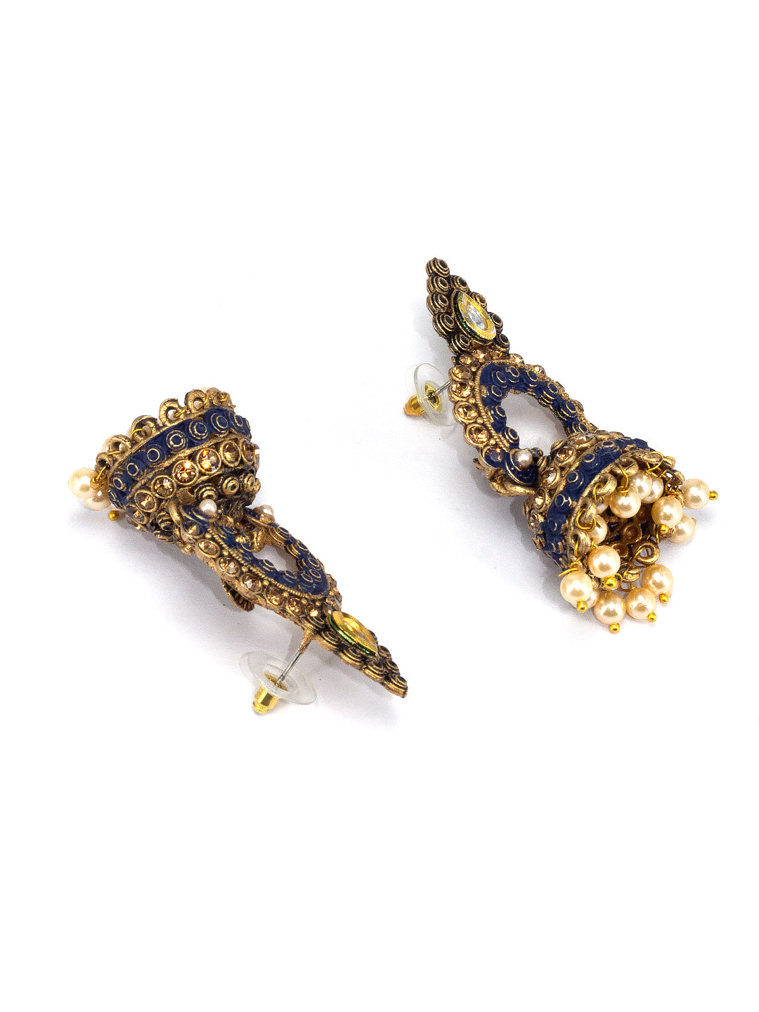 Classic jhumkas, gold-plated, has artificial stones and secured with post & back closure.