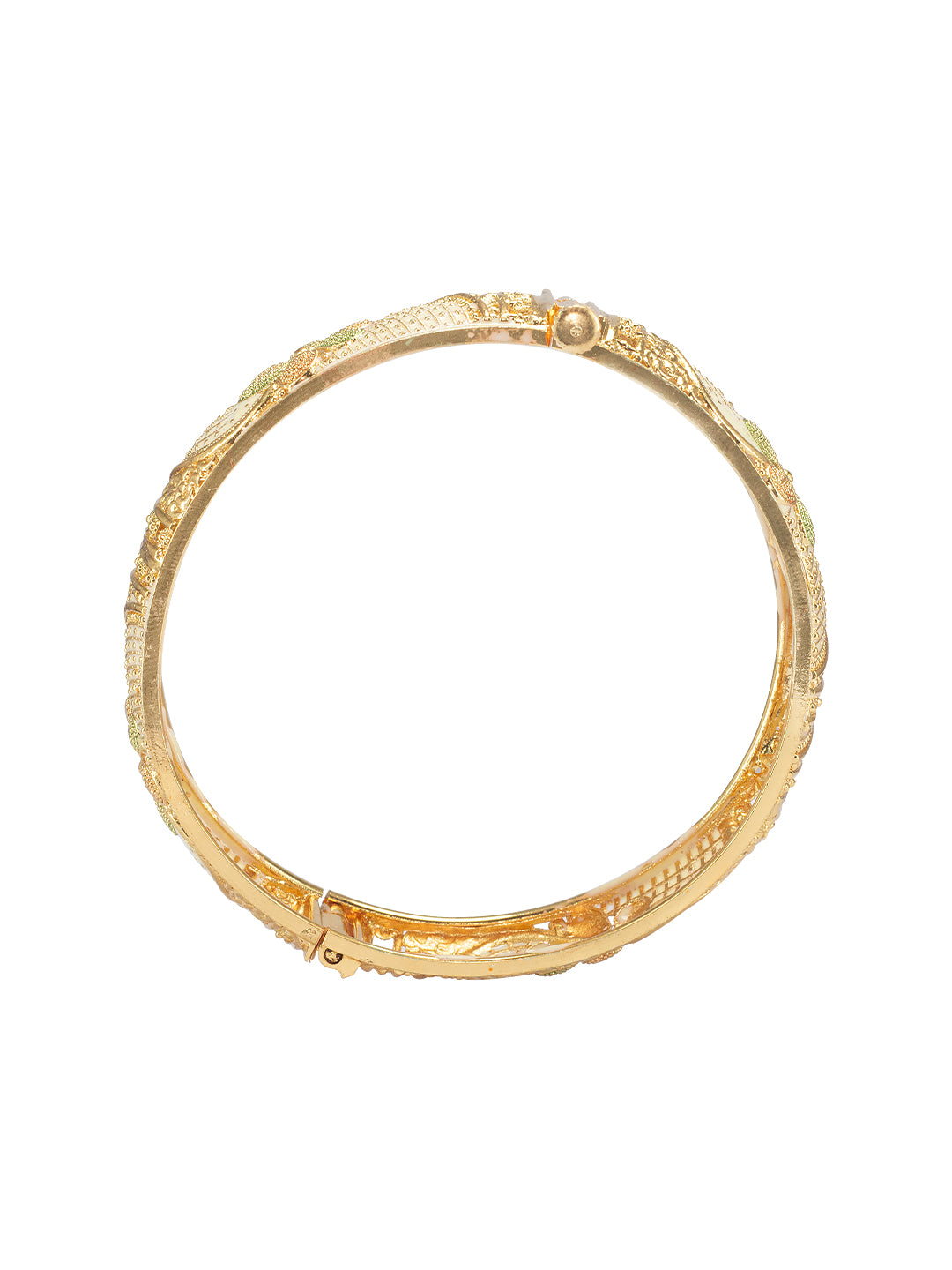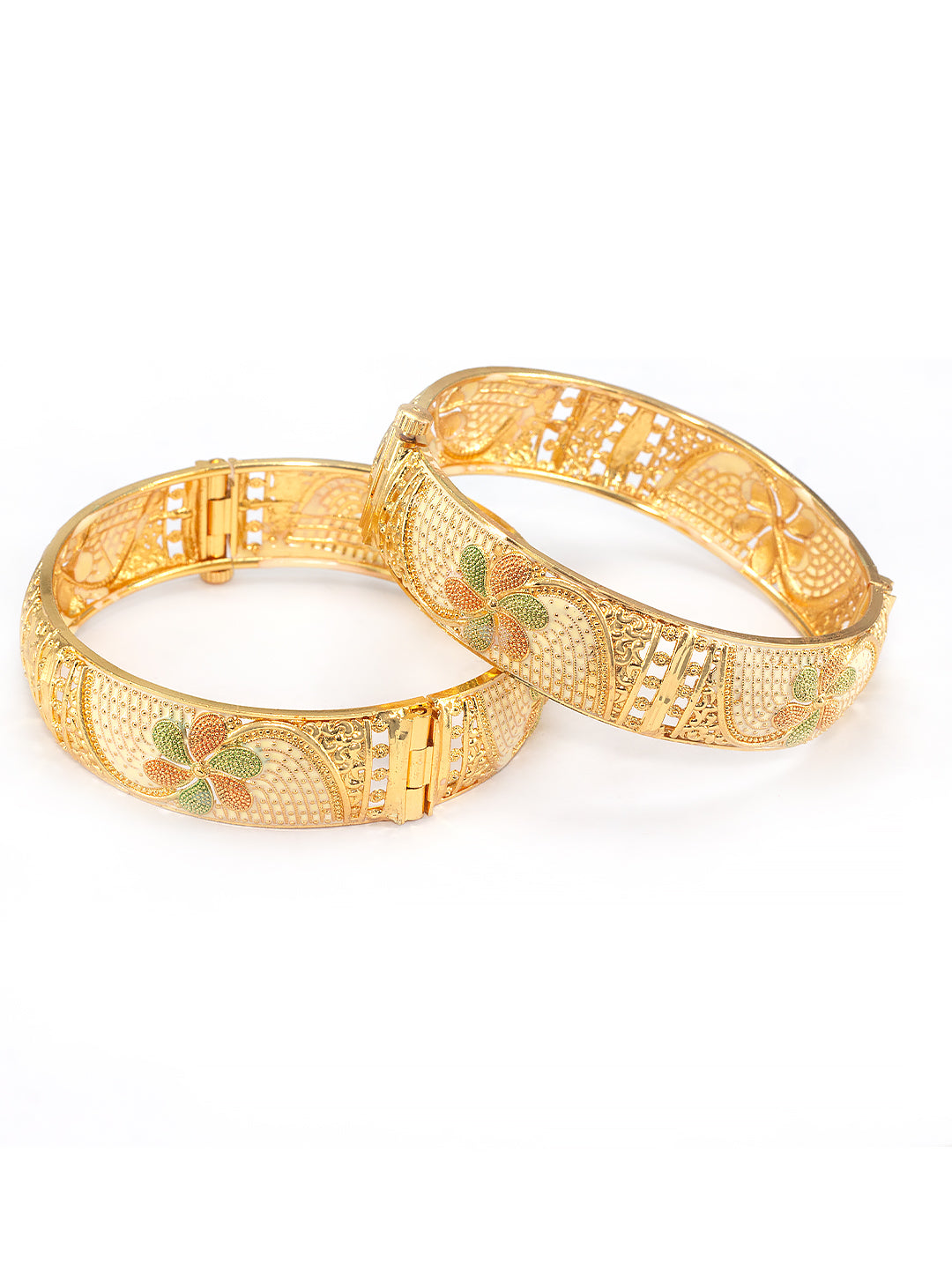This bangle pair are gold plated, has floral motif design and secured with screw closure.