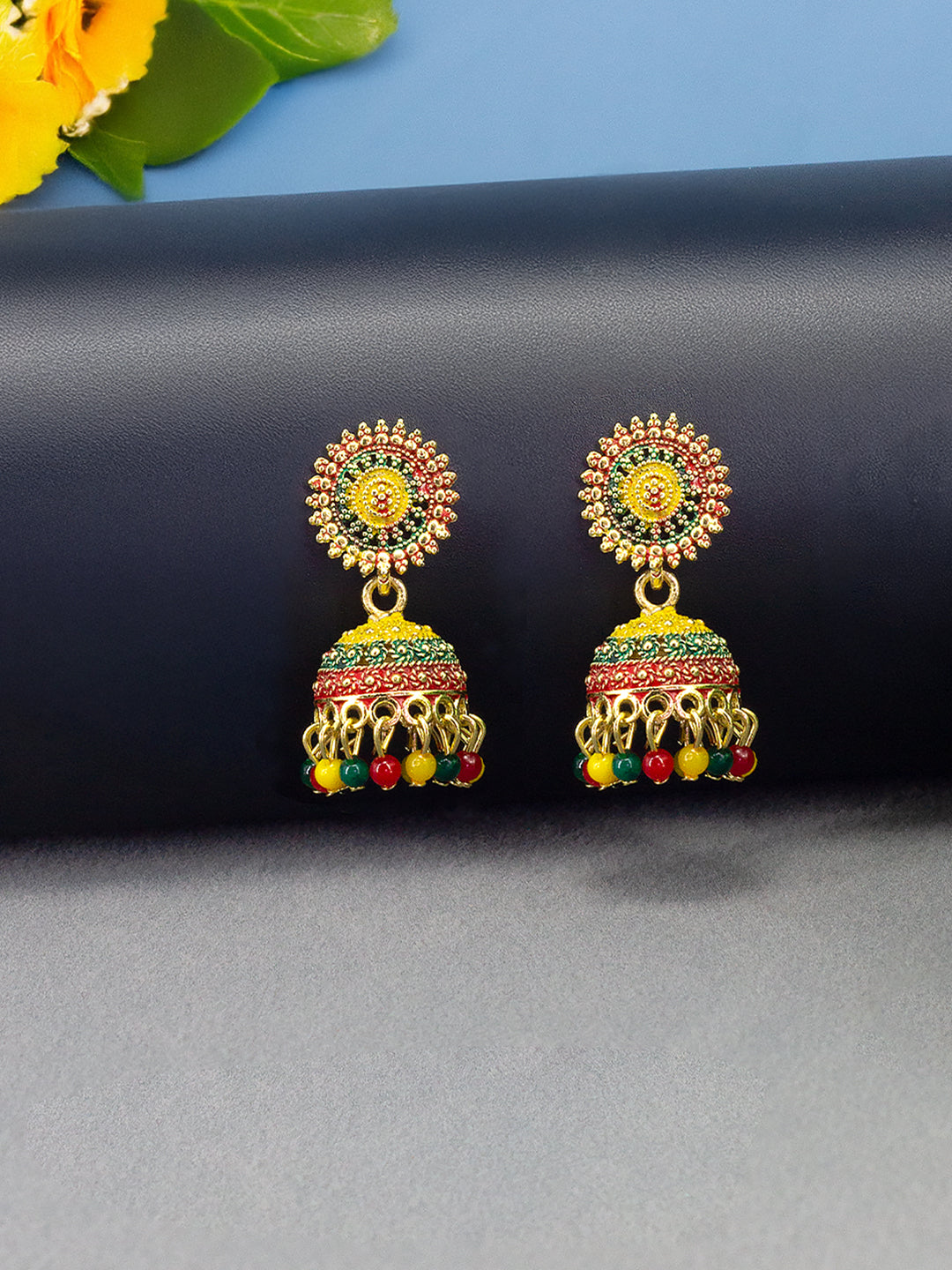 Gold Plated Circular Multi Color Artificial Beaded Jhumki Earrings